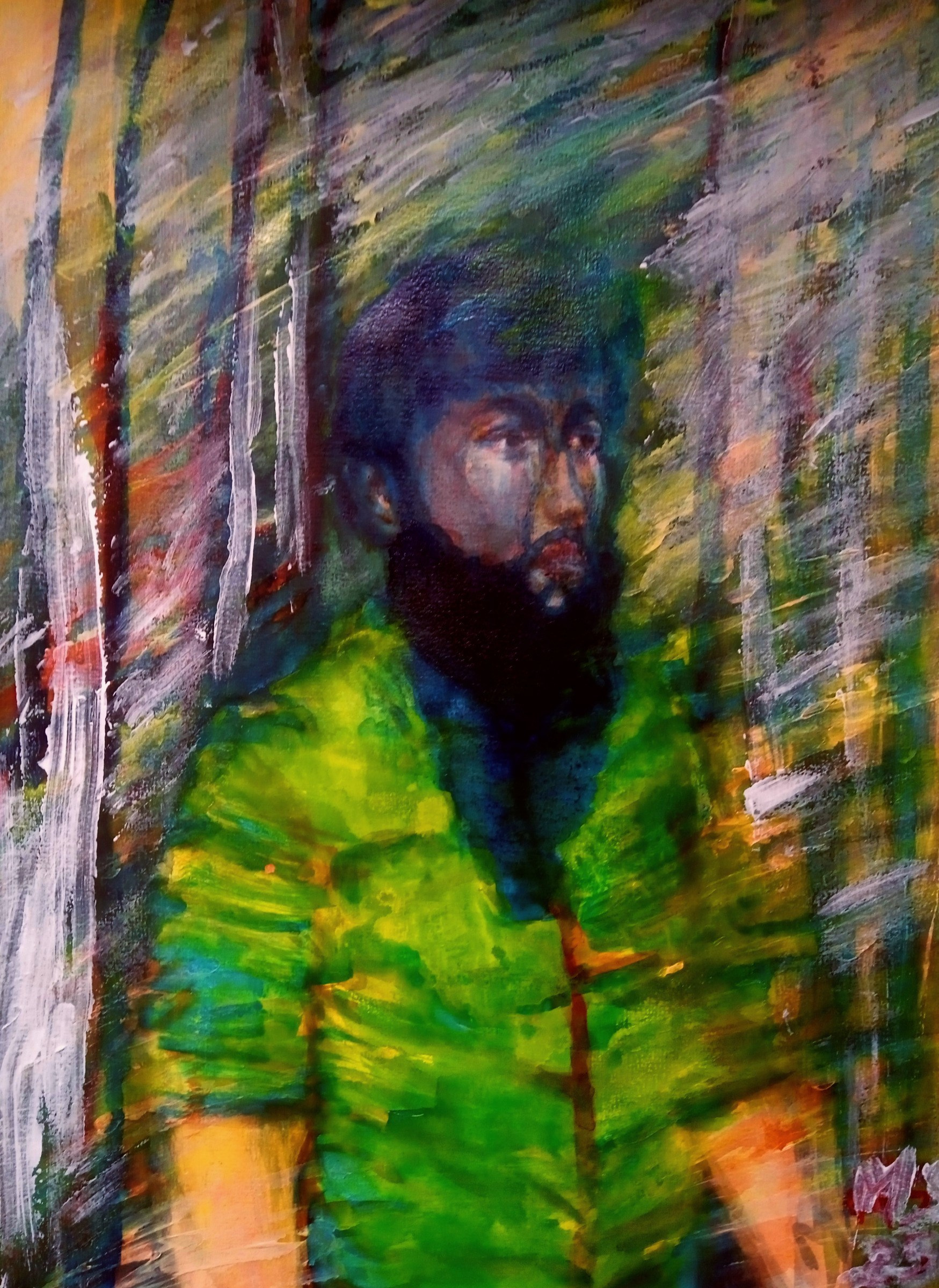 Obraz emanuje tajemniczym i nieco melancholijnym nastrojem. Postać, ubrana w jaskrawozieloną koszulę, wydaje się być zanurzona w otaczającym ją świecie kolorów. Dominują zielenie, błękity i odcienie brązu, co tworzy wrażenie spokoju, ale i pewnego rodzaju zagadkowości. Autor użył mieszanki rozmytych i ostrych pociągnięć pędzla, łącząc je z celowo nierównym użyciem werniksu i lekkimi impastami, nadając dziełu dynamikę i głębię. Elementy abstrakcyjne współgrają z realistycznymi, co dodaje obrazowi warstwy emocjonalnej. Technika artystyczna łączy ekspresjonizm z subtelnymi elementami impresjonizmu, tworząc efekt, który intryguje i pozostawia wiele miejsca na interpretację.
