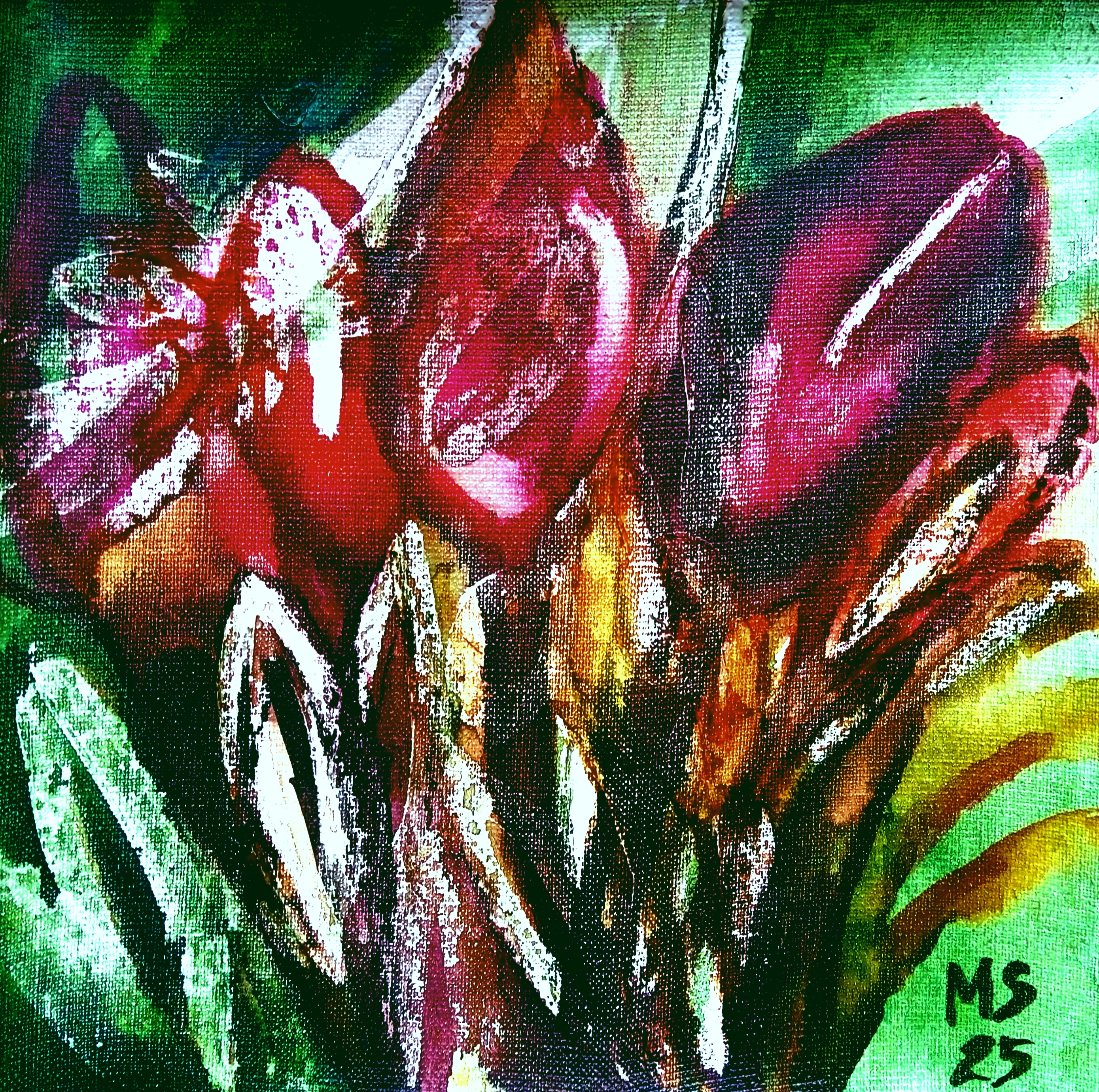 Na obrazie dominują intensywne kolory - głównie czerwień, zieleń i fiolet, które tworzą dynamiczną i ekspresyjną kompozycję. Kontrasty te zdają się pulsować, jakby obrazy miały życie, co sprawia, że całość emanuje energią i pasją. Kształty są niesprecyzowane, bardziej sugerowane niż zdefiniowane, co nadaje dziełu abstrakcyjnego charakteru. Farby nanoszone warstwowo i z użyciem swobodnych pociągnięć pędzla dają wrażenie ruchu i spontaniczności. Obraz może wywoływać różnorodne emocje: od radości po stan kontemplacji. Efekt tego spotkania z dziełem jest niezwykle subiektywny. Kompozycja kusi, przyciąga wzrok, zmuszając do dłuższego zapatrzenia i refleksji. Ten obraz to celebracja życia, ukazująca jego złożoność i barwność. Prosimy nie deptać zieleni ... są tam jeszcze tulipany tusze akrylowe na arkuszu zagruntowanego lnianego płótna format 27 x 27 cm Marzena Salwowska, 2025