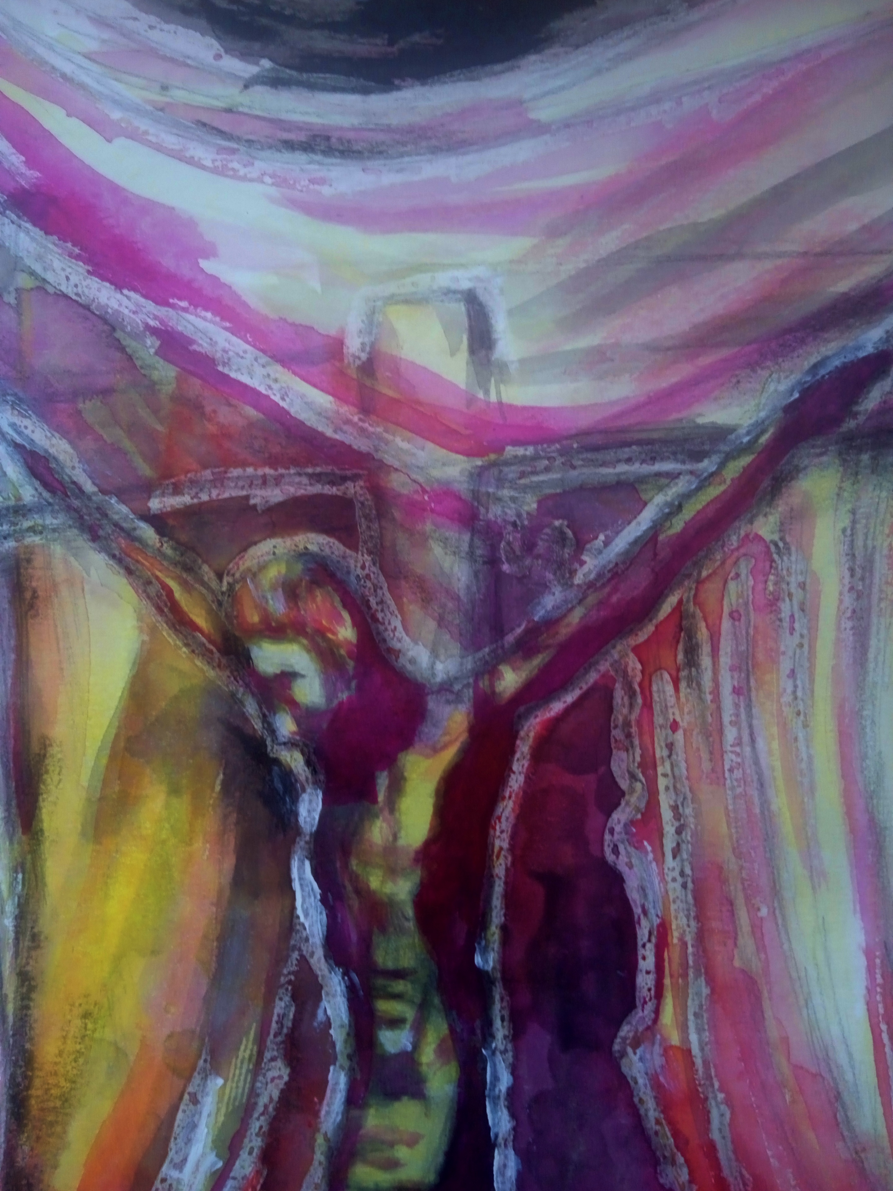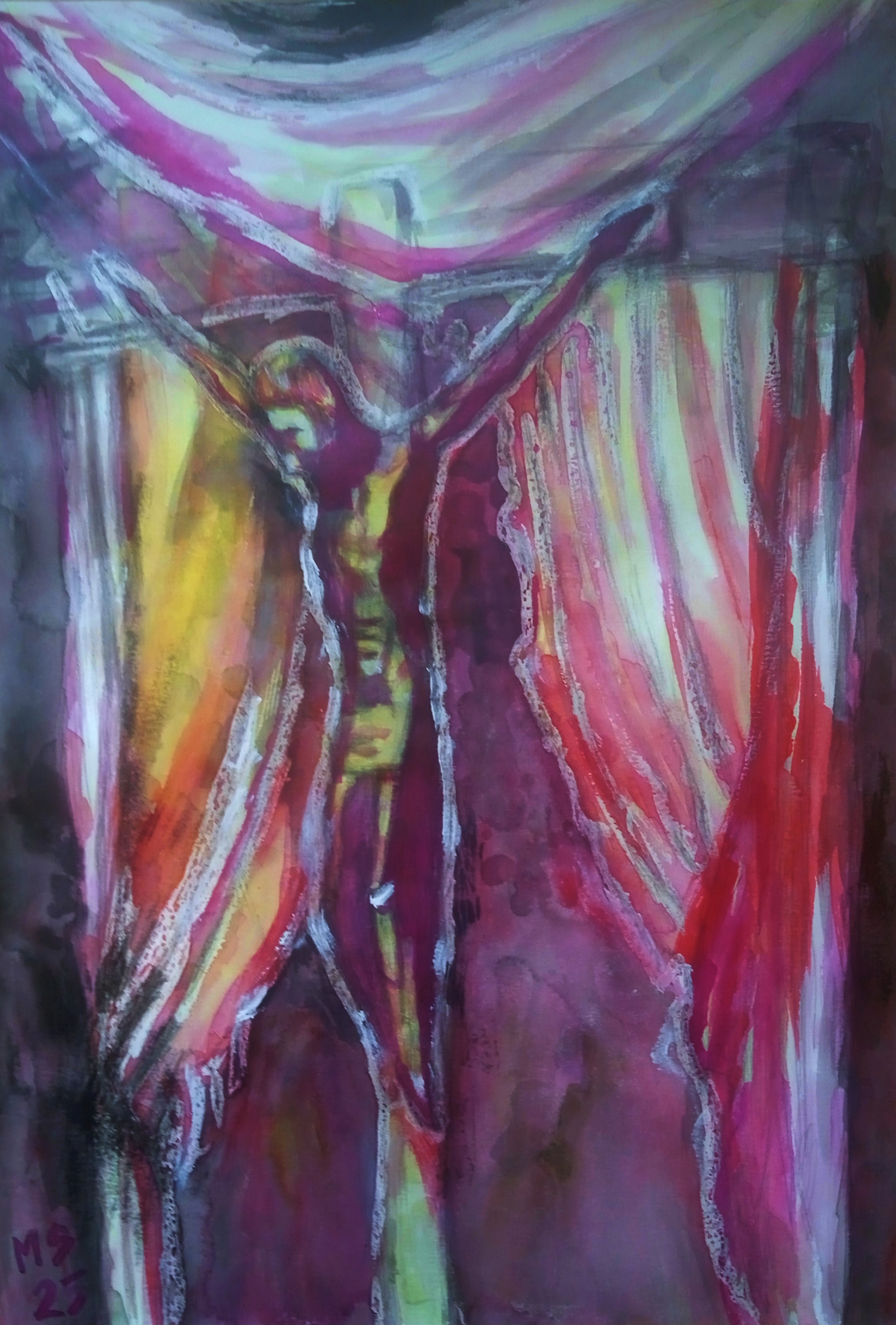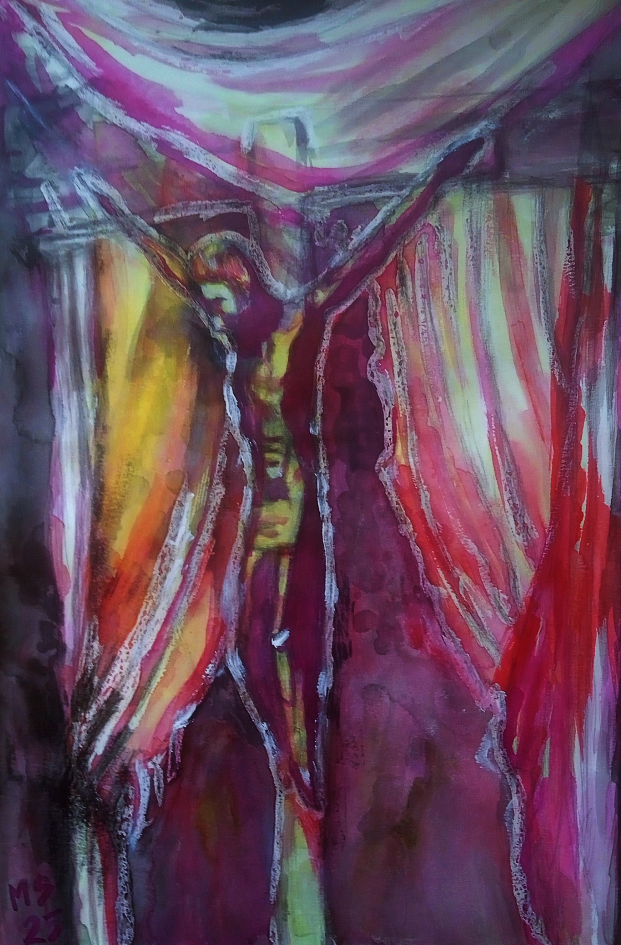 Obraz emanuje intensywnymi barwami czerwieni, fioletu i żółci, które przeplatają się w dynamicznej kompozycji. Centralną postacią jest sylwetka ukrzyżowanego Chrystusa. Otoczona jest kurtynami w różnych odcieniach, które zdają się falować, nadając scenie ruchu i rytmu. Atmosfera dzieła jest ciężka, niemal mistyczna, wywołując uczucie tajemnicy i kontemplacji. Artysta zastosował technikę tuszu przypominającego akwarelę, co dodaje lekkości pomimo intensywnych kolorów. Czuć w tym momencie jakby echo współczesnego ekspresjonizmu. Ten obraz sprawia, że myśli się o ważnych rzeczach i o tym, co jest w środku każdego z nas. Patrząc na to dzieło, widzimy najpierw chaos, a potem... porządek ukryty w detalach. Te przemyślane nierównomierne pociągnięcia pędzla oddają energię i emocje, które są trudne do opisania. Obraz pozostawia odbiorcę z mnóstwem pytań i refleksji.