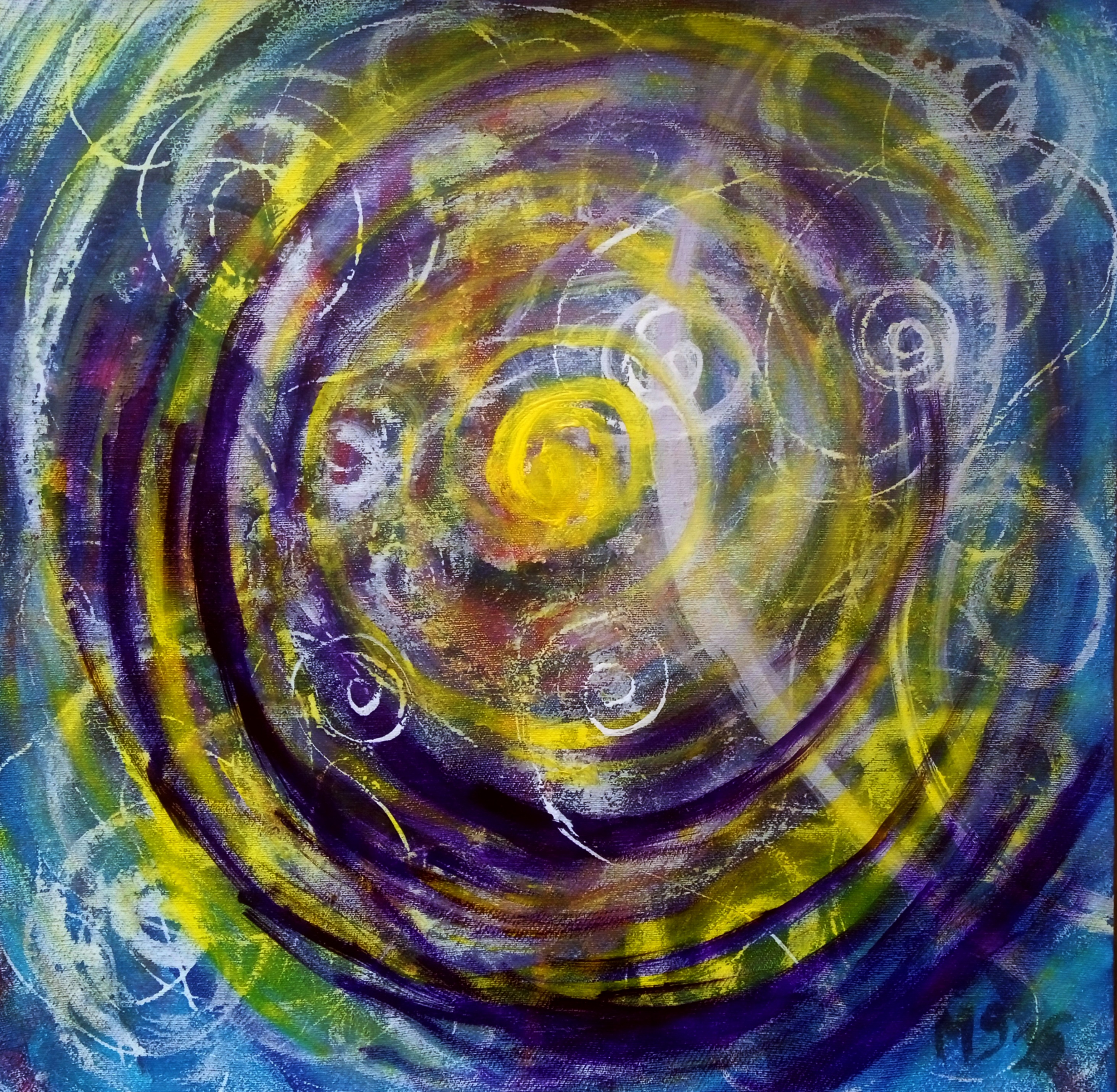 Żyjące Koła/9 tusze i farby akrylowe na zagruntowanym arkuszu lnianego płótna format: 37 x 37 cm Marzena Salwowska, 2025 Obraz jest częścią serii malarskiej luźno inspirowanej wizją proroka Ezechiela Na obrazie dominują wirujące kolory: żółć, fiolety, błękity i biele, które tworzą skomplikowaną sieć na płótnie. Środkowa część obrazu jasno lśni, jak słońce w południe, otoczona bardziej stonowanymi kolorami. Tło oddaje wrażenie niesamowitego ruchu i energii. Atmosfera tego dzieła jest dynamiczna, niemal elektryzująca, a jednocześnie zachowuje pewien element tajemniczości. Artysta posłużył się techniką mieszanych mediów, tworząc teksturalne efekty, które wciągają i angażują widza. Widać tu swobodny styl, ale z wyrafinowaną precyzją. Obraz zachęca do spoglądania w kosmiczny wir, który się nieustannie rozszerza.