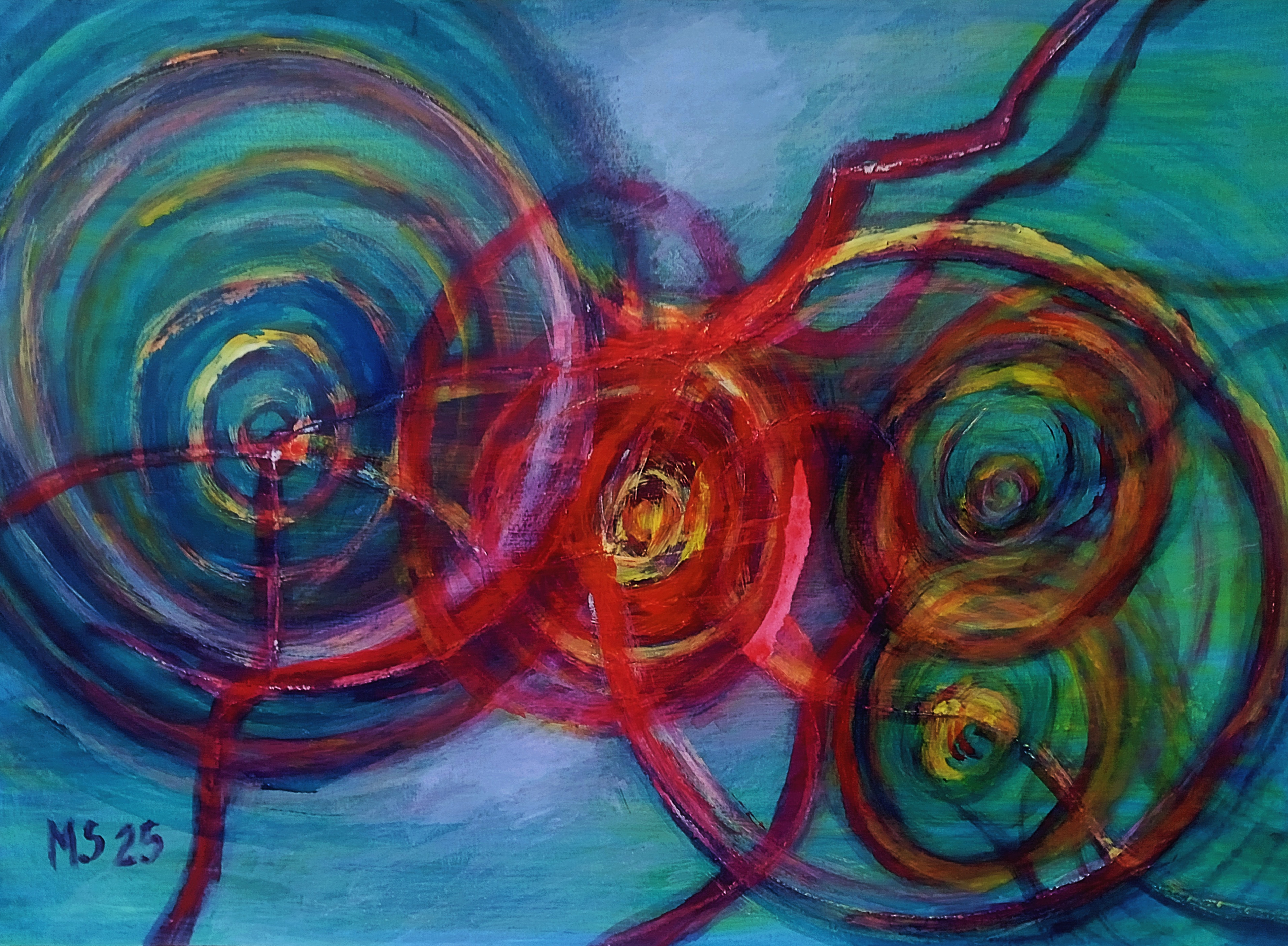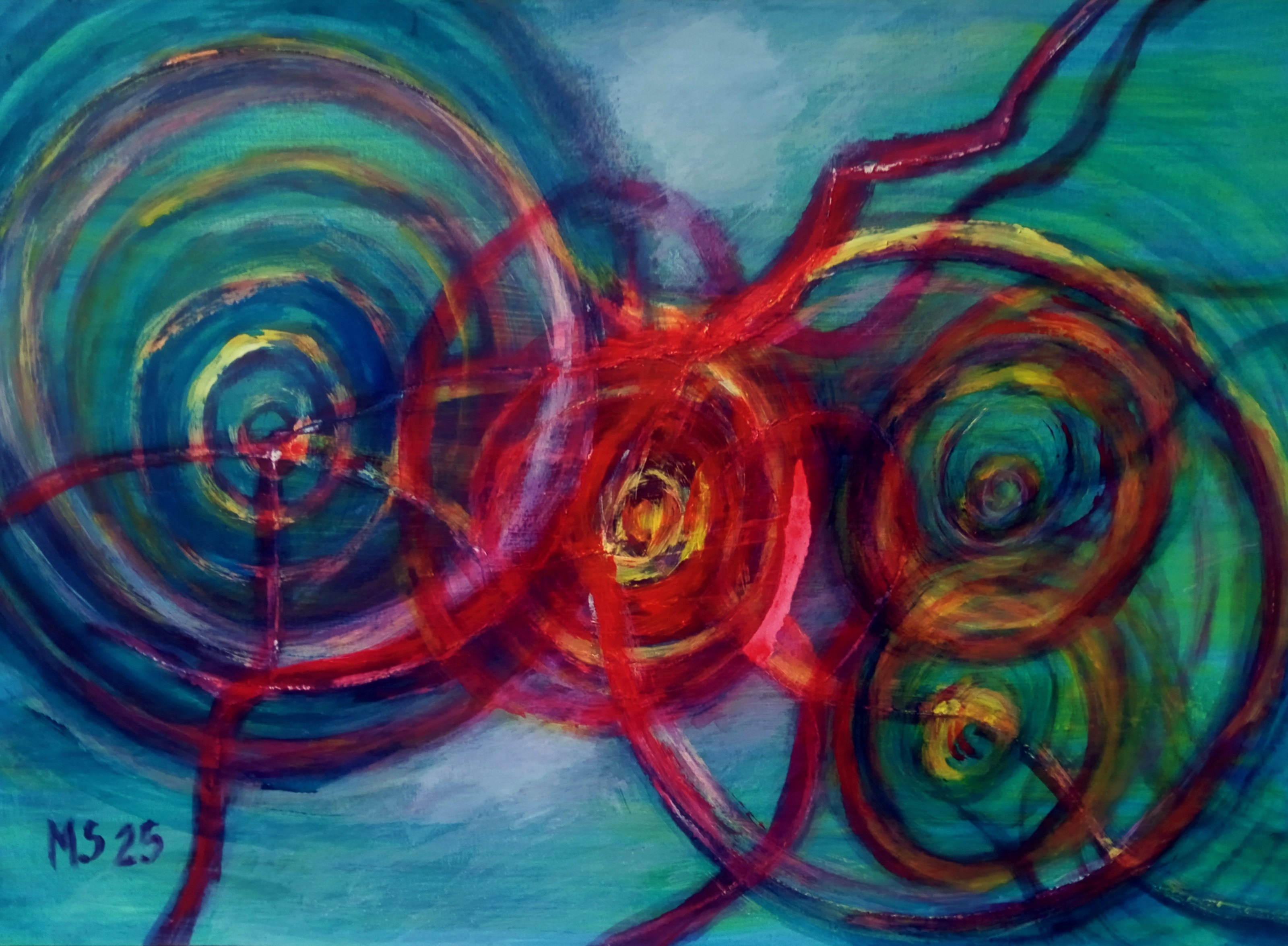 Na obrazie dominują wirujące kręgi w soczystych odcieniach czerwieni, zieleni, turkusu i żółci. Centralny punkt przyciąga uwagę intensywnie czerwonymi liniami, które jak błyskawice przecinają kompozycję. Elementy te nadają obrazowi dynamiczny charakter, jakby obserwator był świadkiem nieskończonego ruchu. Zestawienie barw i kształtów sprawia, że całe dzieło tętni energią i wprowadza widza w stan artystycznej medytacji. Każda spirala i linia zdaje się prowadzić do innego wymiaru.