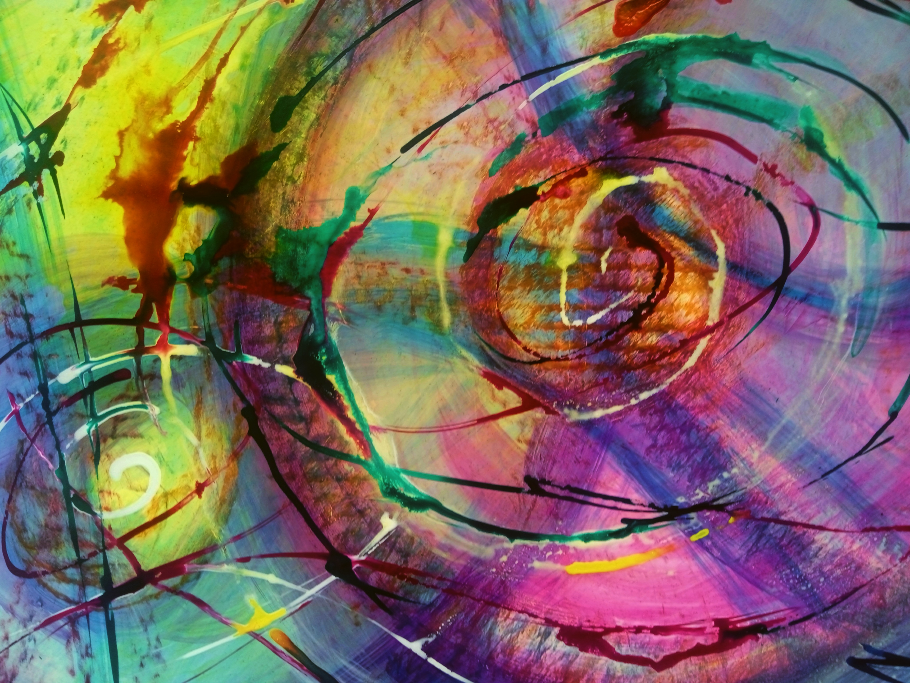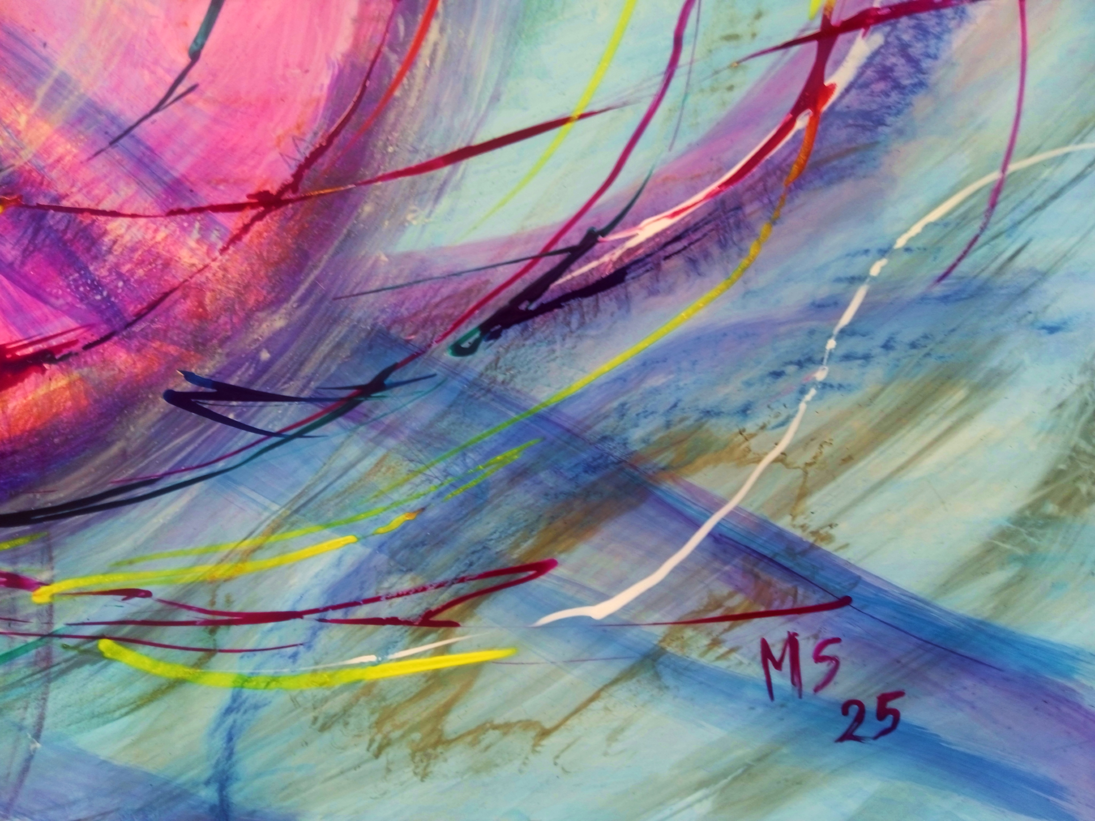 Ten obraz z serii "Żyjące koła" (luźno inspirowanej wizją proroka Ezechiela) to przemyślany taniec kolorów. Dominują odcienie niebieskiego, fioletu i zieleni, które przeplatają się z intensywnym żółtym i różem, tworząc wirujące okręgi. Kształty są dynamiczne, jakby kręciły się w rytm jakiejś nieznanej melodii. Ewidentnie mamy do czynienia z abstrakcją, która zaprasza do osobistej interpretacji. Linia tu jest jakby porozrzucana, wiruje i plącze się, tworząc wrażenie kontrolowanego chaosu. Atmosfera obrazu żyje i tętni energią. Kolorowy wir wciąga obserwatora, wzbudzając w nim uczucia ciekawości i nieskończonych możliwości. Styl artysty przypomina spontaniczny taniec pędzla po płótnie. Tusze akrylowe na gładkim syntetycznym papierze pozwalają na swobodne przeplatanie delikatnych przejść kolorystycznych z malowanymi gestem impastami. Technika jest swobodna, niemal nonszalancka, ale każde pociągnięcie zdaje się być przemyślane.
