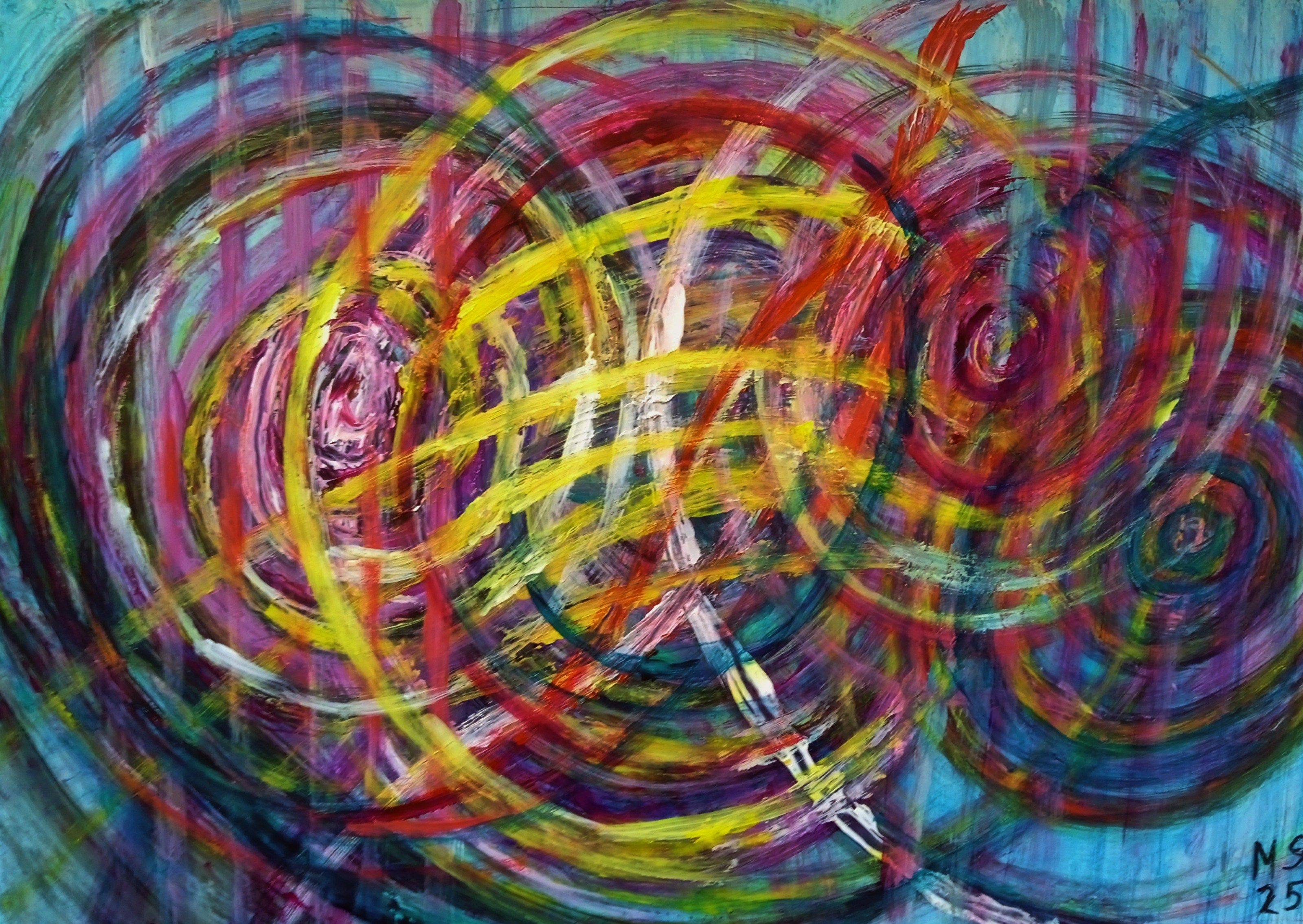 Obraz emanuje kalejdoskopem intensywnych kolorów i pełnią emocji. Dominują tu żółte, czerwone i fioletowe pierścienie, które zdają się wirować w nieustanym ruchu. Tło jest przygaszone, miętowo-niebieskie, co dodaje całości kontrastu jakbyśmy patrzyli przez szybę w deszczowy dzień. Czy to wirująca galaktyka, czy może abstrakcyjny taniec barw? Nastrój jest dynamiczny, niemalże chaotyczny, jakby miał na celu zasypać odbiorcę deszczem ekspresji. Technika artysty jest jak zasada kontrolowanego chaosu. Mieszanie kolorów, odważne pociągnięcia pędzla, brak ostrych krawędzi pozwalają interpretować dzieło swobodnie. Widz może odczuwać przyspieszone bicie serca albo wręcz przeciwnie, poddać się medytacyjnemu stanowi i zauważyć, jak każda dodatkowa warstwa farby opowiada inną historię. Sztuka ta nie jest tylko na pokaz. Ona prowokuje, inspiruje i pochłania obserwatora całkowicie. Obraz jest częścią autorskiej serii "Żyjące koła" luźno inspirowanej wizją proroka Ezechiela. Malowany głównie tuszami akrylowymi na syntetycznym papierze, impasty - farba akrylowa.