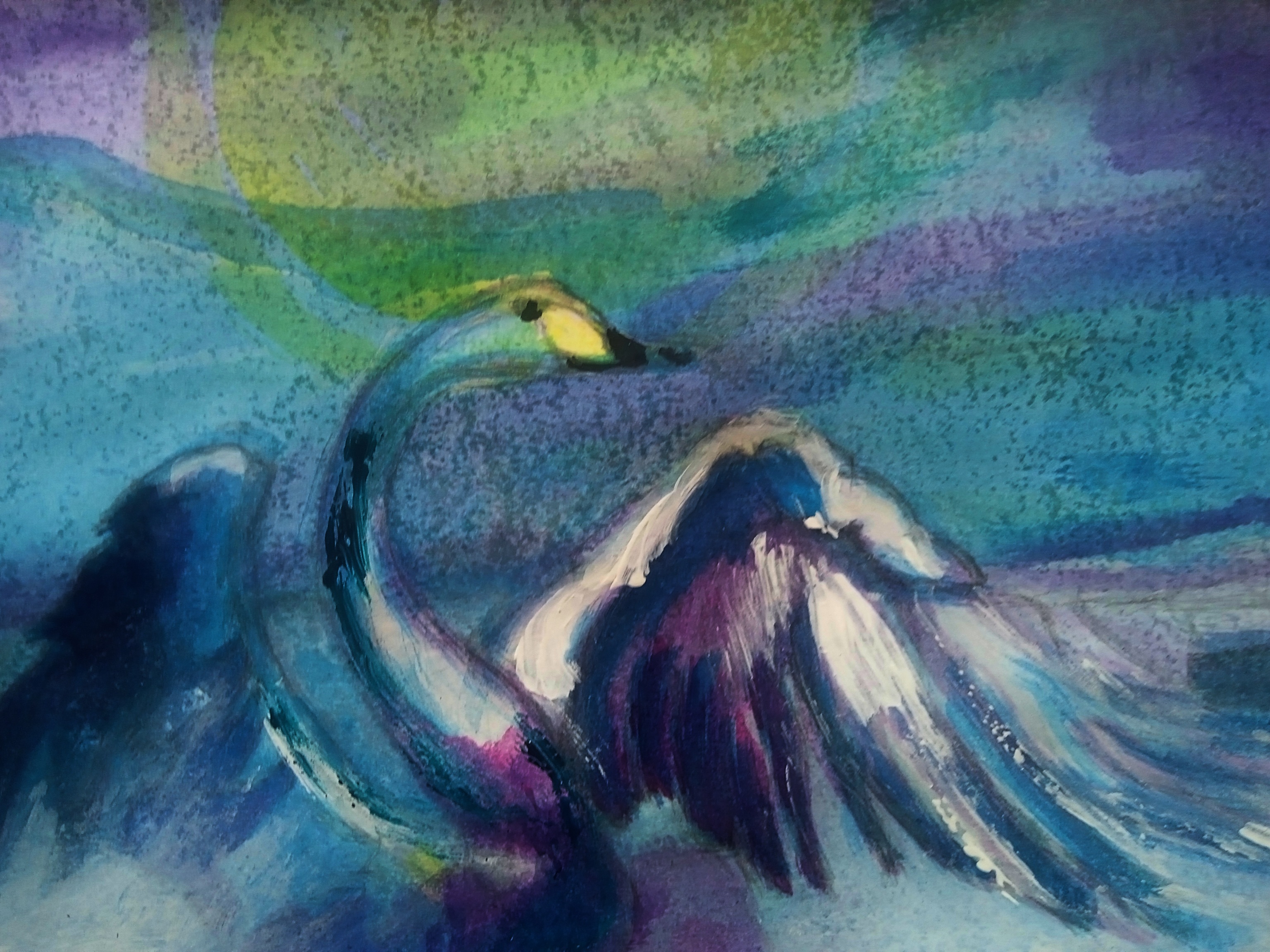 Jezioro Łabędzia Media akrylowe: tusze, farby i medium (rodzaj werniksu zabezpieczającego) Uwaga: Medium akrylowe użyte do werniksowania obrazu powoduje, że w zależności od tego pod jakim kątem ogląda się pracę, wydaje się ona mocno lśniąca lub prawie matowa. Dodaje to obrazowi pewną organiczną zmienność i żywość. autor: Marzena Salwowska rok wykonania: 2025 sygnatury: na awersie i rewersie
