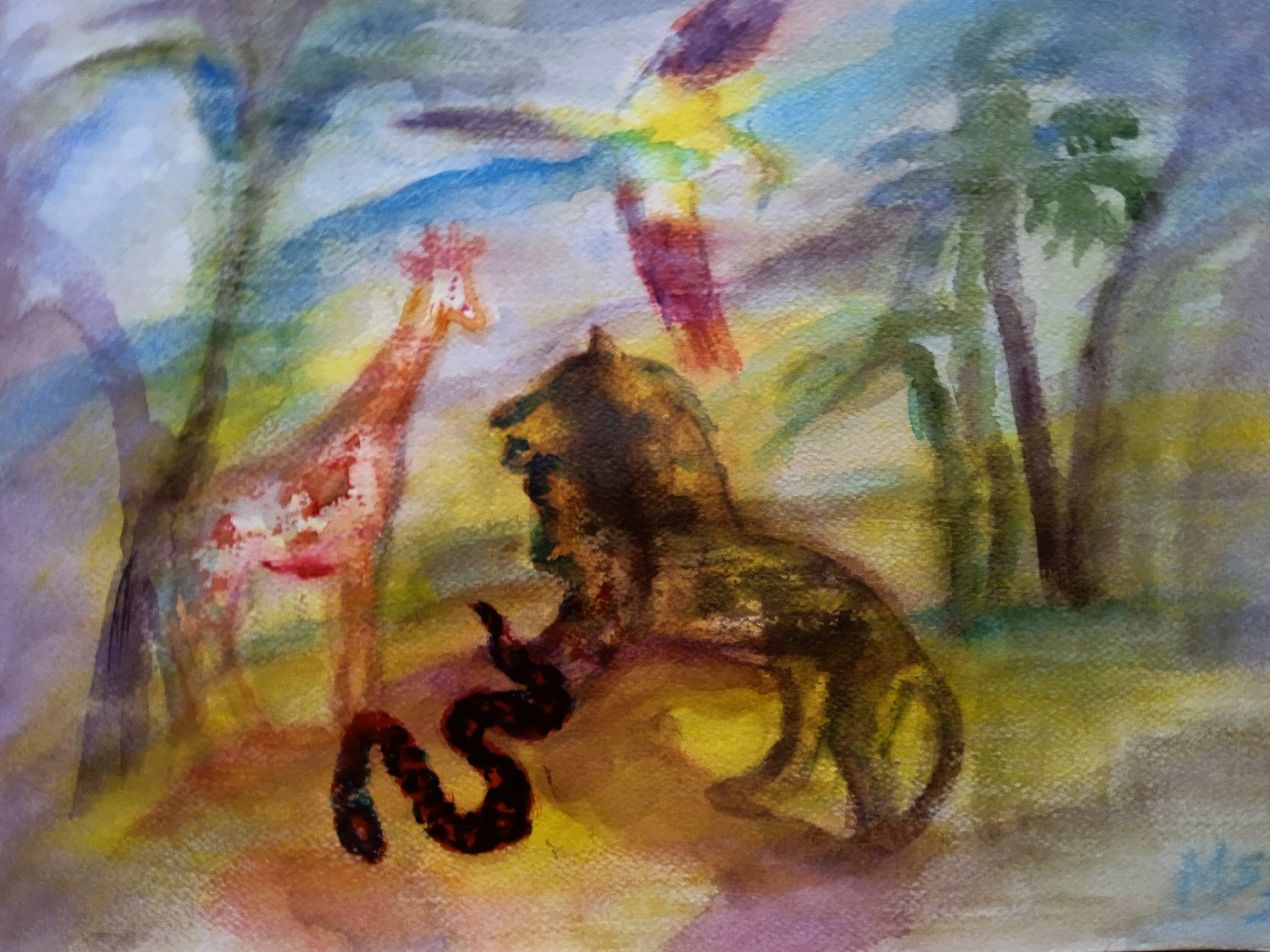 tytuł: Zwierzęta Afryki widziane z Polski Obraz malowany akwarelami, tuszami akrylowymi i farbami akrylowymi na bezkwasowym papierze akwarelowym, częściowo pokryty lekko błyszczącym medium akrylowym. podpis: inicjały autorki i rok wykonania na awersie, imię i nazwisko na rewersie Title: Animals of Africa Seen from Poland Painted with watercolors, acrylic inks, and acrylic paints on acid-free watercolor paper, partially coated with a slightly glossy acrylic medium. Signature: artist's initials and year of creation on the obverse, name and surname on the reverse.