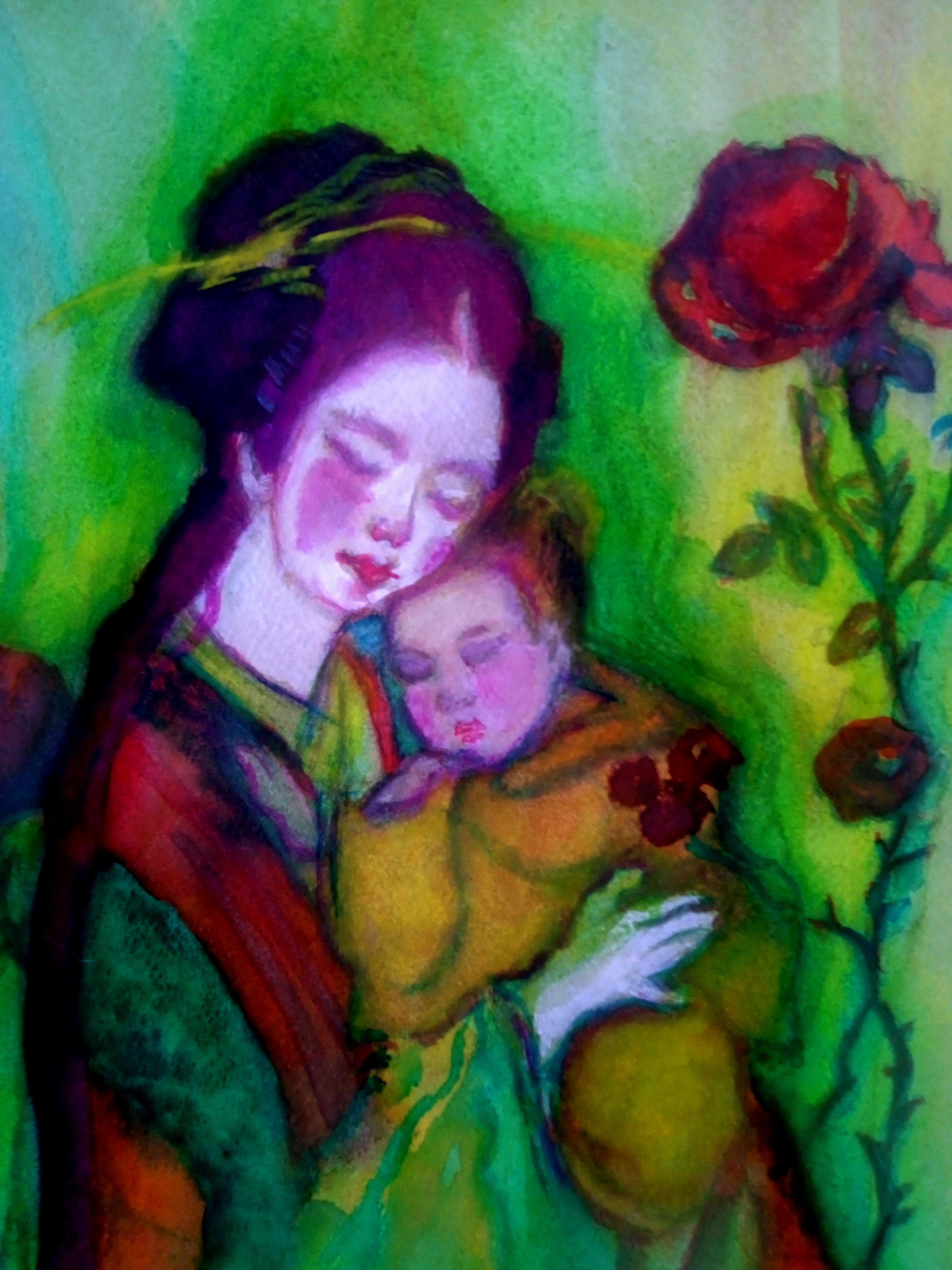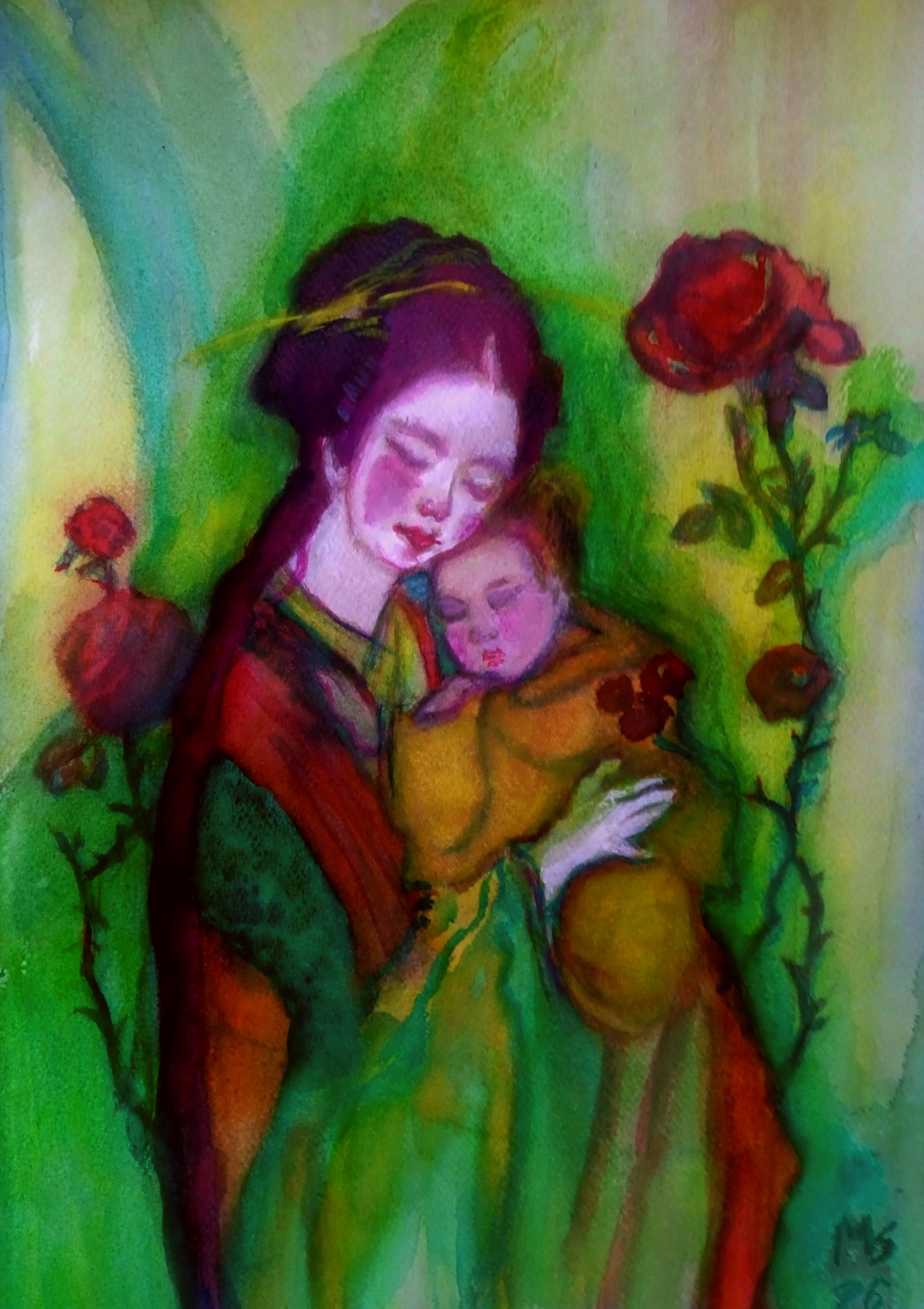 W najnowszej pracy Marzeny Salwowskiej spotykamy się z jednym z najbardziej uniwersalnych i najtrudniejszych motywów malarskich – matczyną bliskością i bezbronnym snem dziecka. Autorka nie ucieka jednak w sentymentalny banał, lecz buduje obraz za pomocą świadomej, bardzo współczesnej akwarelowej ekonomii środków.Najmocniejszym akcentem jest tu pulsujące, niemal wibrujące tło w zakresie zieleni i żółci, które zdaje się oddychać i falować wokół postaci. Ta organiczna, roślinna aura kontrastuje z delikatnie zaznaczonymi, niemal eterycznymi twarzami matki i dziecka – tworząc wrażenie, że obie figury unoszą się w jakimś ciepłym, świetlistym kokonie. Widać tu bardzo świadome operowanie stopniem szczegółowości: im bliżej centrum emocjonalnego (spojrzenie matki, delikatny dotyk dłoni dziecka), tym miększe, bardziej rozmyte przejścia barwne; im dalej od serca kompozycji – tym śmielsze, bardziej ekspresyjne plamy i zacieki. Ten zabieg jest bardzo współczesny i przypomina najlepsze dokonania akwarelowej figuracji ostatnich lat. Czerwień róż – zarówno ta nasycona na płatkach, jak i subtelna na policzkach i ustach – pełni funkcję cichego serca obrazu. Nie jest to jedynie dekoracyjny akcent; to właśnie czerwień scala emocjonalnie całą kompozycję i nie pozwala widzowi zbyt długo pozostać w roli chłodnego obserwatora. Podpisana i datowana praca z 2026 roku pokazuje artystkę w pełni dojrzałą fazę – swobodną w posługiwaniu się medium, a jednocześnie bardzo uważną na to, co chce powiedzieć. To obraz, który jednocześnie koi i niepokoi – bo w tej idealnej bliskości wyczuwa się ulotność i kruchość chwili. Podsumowując, jest to poruszająca i – co w dzisiejszych czasach wcale nie jest oczywiste – szczera akwarela. Polecamy do kolekcji prywatnych poszukujących sztuki figuralnej o wyraźnym ładunku emocjonalnym i wysokim poziomie malarskiej wrażliwości. Specyfikacja techniczna pracy: Różana Wiosna w Akita Akwarele, tusze akrylowe i guma arabska na bezkwasowym papierze akwarelowym (300 g/m²) Wykończenie: W zależności od kąta patrzenia powierzchnia obrazu jest matowa, bądź nierównomiernie błyszcząca (co momentami daje wrażenie lekkiego ruchu postaci). format A3 bez ramy sygnatura na awersie: MS 26