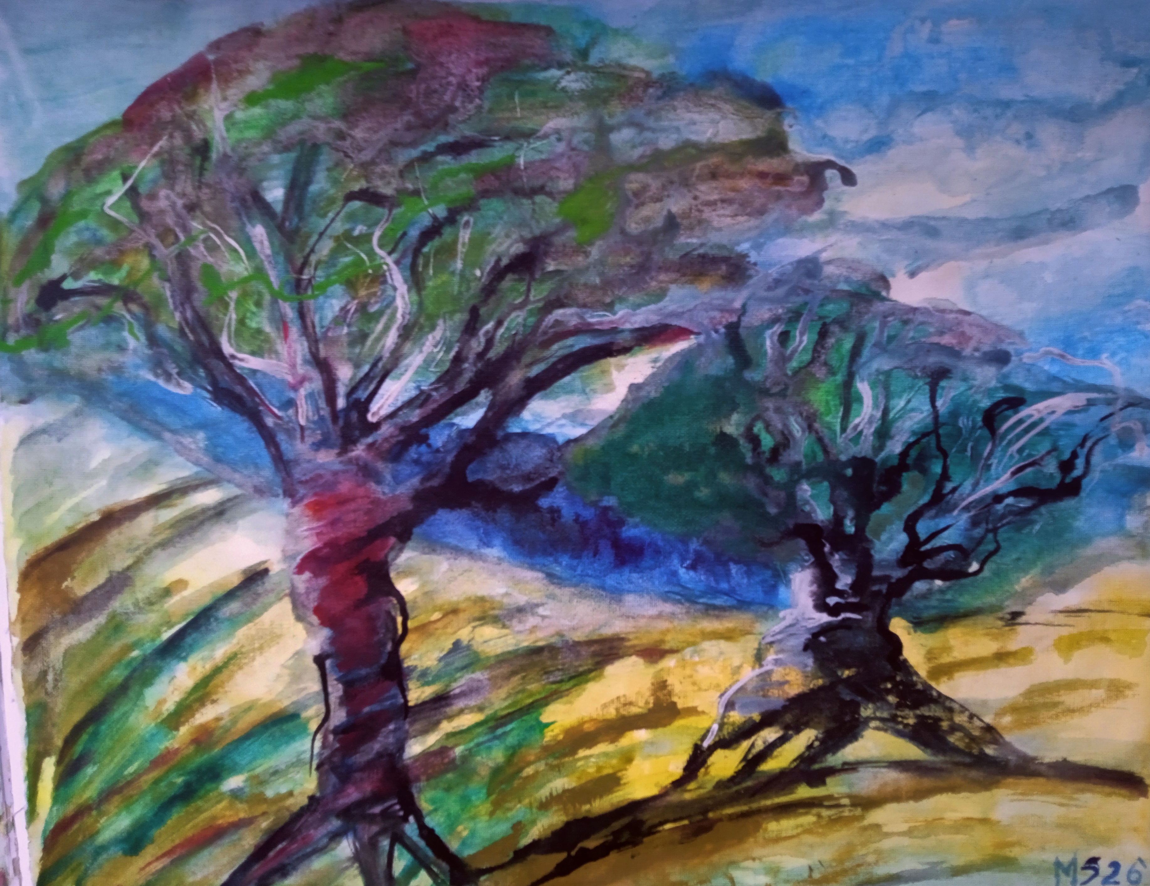 Obraz osiąga rzadko spotykane połączenie ulotności akwarelowej materii z mocną, niemal rzeźbiarską obecnością drzew. Autorka nie tyle przedstawia pejzaż, co pozwala widzieć ruch – ten konkretny, gwałtowny powiew, który właśnie w tej chwili modeluje korony i wygina grube konary. Technika warstwowego nakładania akwareli i tuszów akrylowych pozwala autorce uzyskać efekt głębokiej, wibrującej przestrzeni – kolory nie leżą płasko, lecz przenikają się, rozmywają i ponownie wyłaniają, tworząc wrażenie, że patrzysz na krajobraz przez chwilę silnego podmuchu. Niebieskie i turkusowe pasaże nieba przechodzą w fioletowo-różowe chmury niemal impresjonistycznym gestem, lecz bez słodkawej miękkości – jest w tym geście siła i pewność. Partie pni i korzeni, malowane gęstym, czarnym tuszem, kontrastują z eterycznością koron i nieba, nadając drzewom materialną, niemal cielesną ciężkość. Ten kontrast między ulotnością a trwałością jest jednym z najmocniejszych akcentów pracy. "Trochę wiatru w drzewach" to obraz, który nie prosi o kontemplację w ciszy – raczej zmusza widza, by sam poczuł ten wiatr na skórze. Ta ekspresyjna praca łączy w sobie liryzm, energię gestu i bardzo współczesne wyczucie koloru. Specyfikacja techniczna obrazu: tytuł: Trochę wiatru w drzewach media: akwarele i tusze akrylowe na cienkim arkuszu płótna o wymiarach 50 x 40 cm bez oprawy obraz sygnowany Marzena Salwowska, 2026