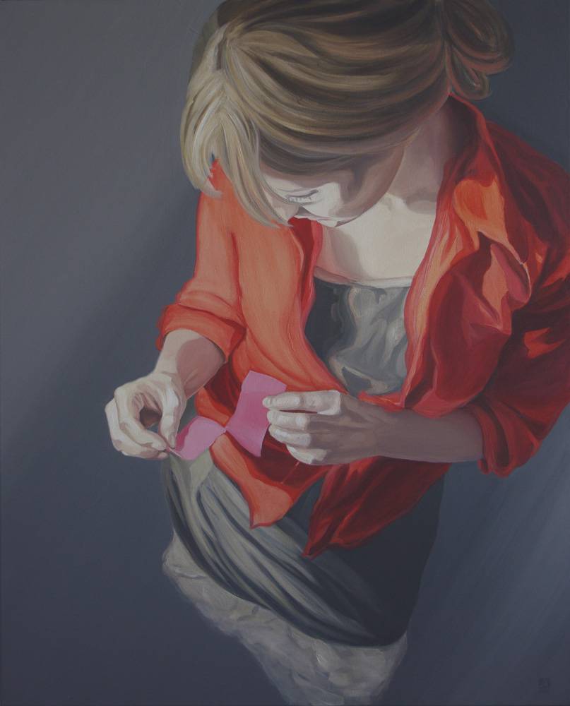 Obraz przedstawia postać widzianą z góry, ubraną w jasnoszarą sukienkę z czerwoną, wyrazistą koszulą. Kontrast stanowią wielkie bryły intensywnych kolorów, jak odcienie czerwieni i szarości. Koszula wydaje się żywa, niemal pulsująca jak ogień. Postać skupiona, trzyma na kawałku różowego papieru. Wygląda to jak magiczny moment, pełen zadumy i spokoju. Atmosfera jest intymna, jakby świat zewnętrzny na chwilę przestał istnieć. Artysta zdaje się preferować grube, płynne pociągnięcia pędzla. Styl jest realistyczny, a jednocześnie jest w nim coś surrealistycznego. Chwila zamknięta w obrazie wydaje się trwała, a zarazem ulotna. Praca może wywołać refleksje o codziennych chwilach, które niespodziewanie stają się ważne. Takie little things in life. Ciekawym elementem jest kompozycja. Punkt widzenia z góry daje poczucie, że to podglądanie, co potęguje intymność chwili. Kolory sugerują ciepłe emocje towarzyszące postaci. "Ja też kiedyś robiłem coś z papierem" — to powiedziałoby dziecko, zauważając prostotę sceny. Podziwiam to, jak artysta uchwycił subtelności gestu. Jest coś magicznego w cichej kontemplacji. Obraz może wzbudzać refleksję o wartości drobnych momentów życia. Praca ma w sobie pewną czułość, która niechybnie chwyta za serce i sprawia, że chcemy zatonąć w tej cichej, spokojnej chwili.
