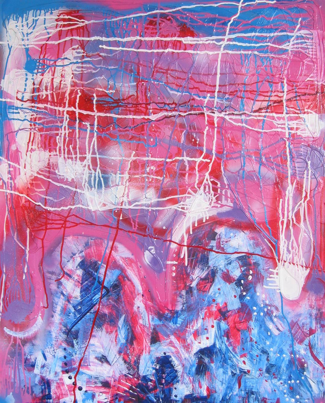 Obraz przenosi nas do tętniącego kolorami świata, gdzie dominuje intensywna paleta różu, niebieskiego i bieli. Dynamiczne linie i plamy tworzą chaotyczną, ale harmonijną kompozycję. Czerwone, białe i niebieskie smugi wyglądają jak symfonia ruchu i energii, jakby ktoś właśnie rozlał farbę w przypływie artystycznej furii. Efekt "drip" nadaje dziełu spontaniczności typowej dla Jackson Pollocka, choć jest tu więcej precyzji. Na oko, bardziej structured chaos. Atmosfera obrazu jest elektryzująca, jakby za chwilę miało wydarzyć się coś ważnego. Nie sposób oderwać wzroku, bo ciągle odkrywasz nowe szczegóły, jak w dziecięcym kalejdoskopie. A może to kosmos pełen gwiazd? Kto wie. Można niemal poczuć ekscytację, jaką artysta musiał czuć, kreując to dzieło. Styl jest zdecydowanie nowoczesny, z wyraźnymi wpływami ekspresjonizmu abstrakcyjnego. Ten obraz ja widząc, wywołuje we mnie niepokój, ale i zachwyt. Jakby chciał mi powiedzieć: "Hej, nie bądź taki poważny!" Czuć w tym wszystkim jakąś lekkość, humor nawet. Tak jakby artysta, bawiąc się farbami, zapomniał o całym świecie. To taki “wow moment”, gdzie zaczynasz się zastanawiać, co ty byś tu dodał, co zabrał. Wszystko skoncentrowane na emocjach, które mogą być różnorodne: od radości po zdumienie.