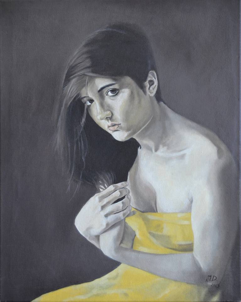 Obraz przedstawia młodą kobietę, ubraną w intensywnie żółtą tkaninę, która kontrastuje z ciemnym, stonowanym tłem. Dominują tu odcienie szarości i brązu, które tworzą spokojną i melancholijną atmosferę. Postać zwrócona jest do widza z nieco zamyślonym wyrazem twarzy. Światło delikatnie pada na jej włosy, tworząc subtelne refleksy. To trochę jakby światło chciało przełamać mrok otaczający dziewczynę. Artysta używał gładkich pociągnięć pędzla, nadając obrazowi elegancji i płynności, ale też nutki surowości. Zupełnie jakby chciał połączyć klasyczne techniki z nowoczesnym twistem. Kiedy patrzę na ten obraz, czuję pewną nostalgię, jaką może wywoływać spojrzenie ku przyszłości z nutą niepewności. Może ta dziewczyna myśli o czymś ważnym? "Ona wygląda smutno," powiedziałoby dziecko, które zauważa, że coś jest nie tak. Może to ten żółty, który przypomina mi ciepło słonecznego dnia, przyciąga uwagę. W pewien sposób, ta mieszanka emocji sprawia, że obraz jest po prostu captivating. Zastanawiam się, jaką historię kryje jej spojrzenie i co mogłaby nam powiedzieć, gdyby mogła mówić. To prowokuje do refleksji nad delikatnością i kruchością życia, zawartą w jednej chwili.