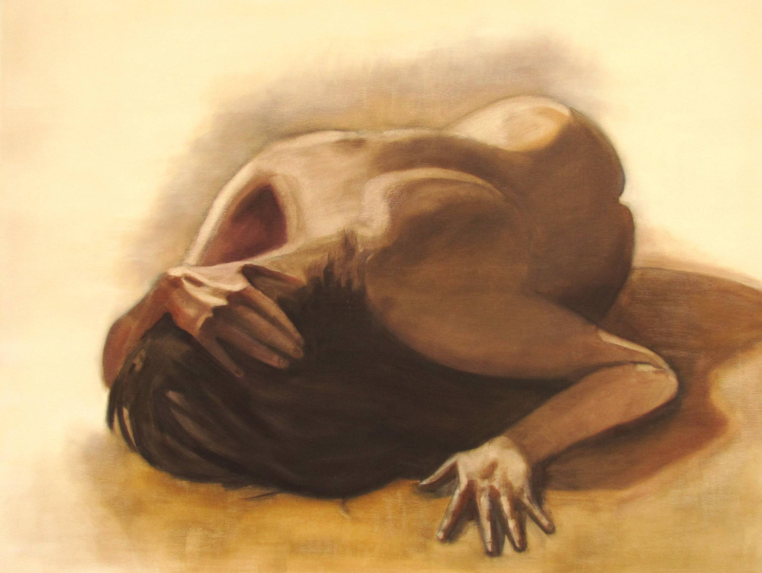 Obraz z kolekcji dyplomowej wykonany w technice olejnej, poprzez nakładanie farby za pomocą laserunku oraz przecierek w celu uzyskania wrażenia delikatnego ciała kobiecego, a zarazem jego ciężaru.