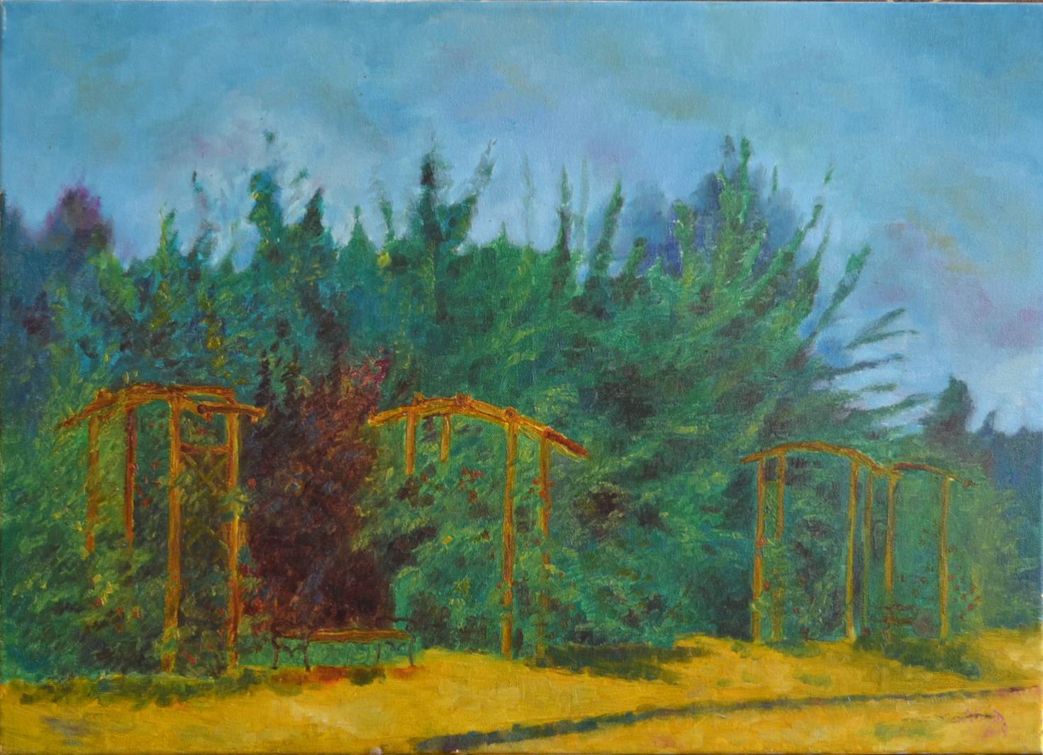 Obraz przedstawia spokojny pejzaż z dominującymi odcieniami zieleni i niebieskiego, a w jego centrum widać drewniane pergole, które zdają się zupełnie tonąć w bujnej roślinności. Kształty są subtelne i nieco rozmyte, co nadaje całej kompozycji wrażenie tajemniczości. Atmosfera obrazu jest iście sielankowa, emanuje spokojem, ale jednocześnie kryje w sobie nutę niepokoju, jakby za chwilę miało coś się wydarzyć. Technika, jaką posłużył się artysta, wskazuje na inspirację impresjonizmem, z zaznaczeniem tej gry światła na liściach i niebie. Na pewno czujesz też freedom w tym sposobie malowania. Obraz może wywołać u widza uczucie nostalgii, przypominając ciche popołudnia spędzone na łonie natury. Dla mnie to jak przeniesienie się do krainy dzieciństwa, gdzie wszystko jest możliwe. Wyobrażam sobie, że drewniane pergole prowadzą do jakiegoś magicznego ogrodu, ukrytego pośród drzew. Twórczość taka inspiruje do zadumy, a jednocześnie pozostawia przestrzeń dla indywidualnej interpretacji. Może to być miejsce relaksu, ale także przemyśleń nad ulotnością chwili. To jest takie secret place, które każdy chciałby odkryć na własną rękę.