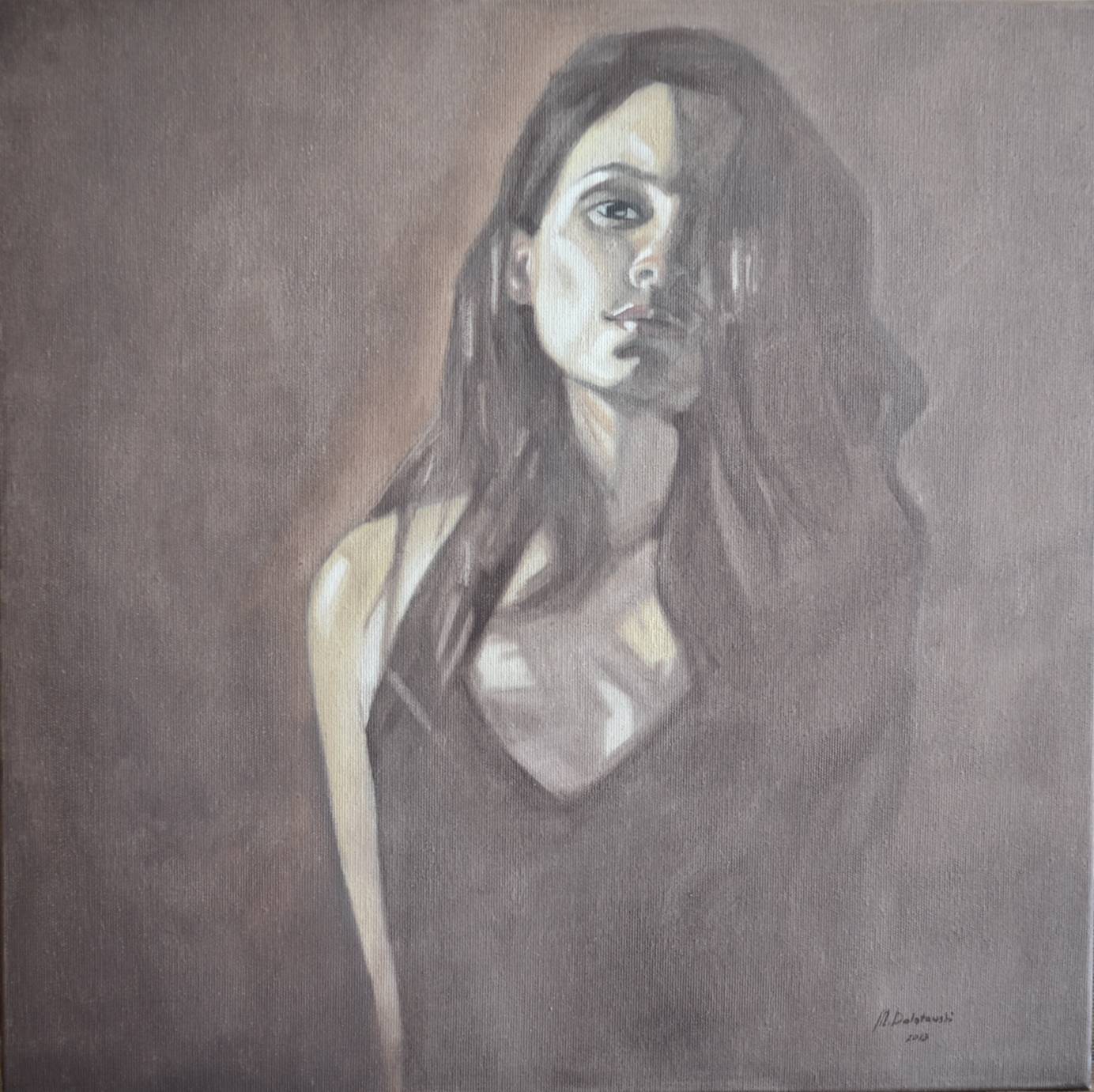 Obraz wykonany w technice olejnej poprzez nakładanie farby za pomocą laserunku oraz stosowanie przecierek.