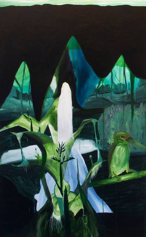 Obraz pełen zieleni, tajemniczych kształtów i kontrastów, które ciężko nie zauważyć. Kolory – głównie zielone i niebieskie – przeplatają się z ciemnymi plamami, tworząc intrygującą kompozycję. Centralnie widoczna jest postać przypominająca ptaka, siedzącą na gałęzi, co wprowadza element życia do tej nieco surrealistycznej sceny. Góry w tle przypominają zęby smoka, a ich nieregularne krawędzie kopią wzrok. Nastrój dzieła jest pełen tajemnicy, jakby odkrywał zapomniany zakątek świata, gdzie natura rządzi swoimi prawami. Styl artysty łączy w sobie elementy ekspresjonizmu i surrealizmu. Dynamiczne pociągnięcia pędzla oraz nieoczywiste kolory potęgują wrażenie ruchu. Patrząc na obraz, ma się ochotę odkrywać każdy szczegół, jakby wejść w tajemniczy las. Wywołuje to także poczucie niepokoju, coś w stylu "coś tu jest nie tak, ale nie wiem, co" – a potential mystery. Emocje? Jedno wielkie wow, malarska zagadka! To trochę jak obraz z bajki, gdzie wszystko wydaje się możliwe. Myśli płyną swobodnie, podpierane kolorami i formami. Takie obrazy wzbudzają refleksje nad nierozpoznawalnym pięknem natury i naszym miejscem w jej wnętrzu. Eksploracja, cisza, wzajemne przenikanie się światów – to, co dziecko powiedziałoby: "Patrz mamo, tam jest dziwna góra!". Jest w tym jakaś magia, której nie sposób opisać słowami – trzeba ją poczuć na własnej skórze.