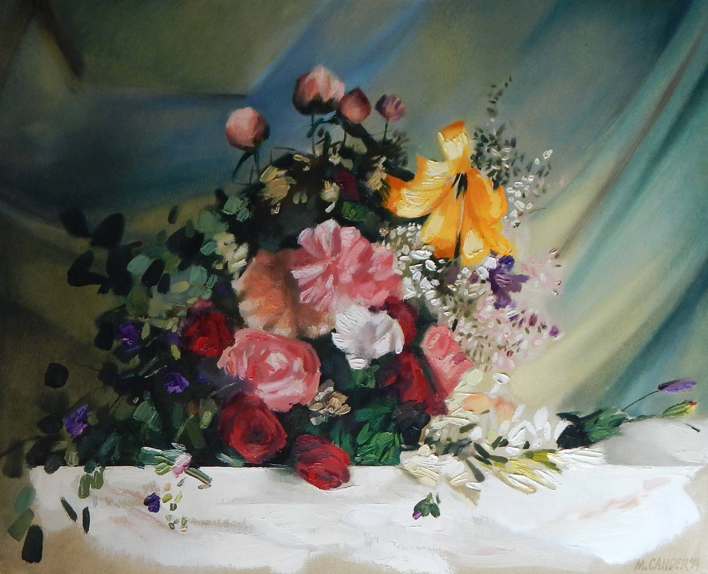 Na obrazie widać bukiet kwiatów, który zdaje się oddychać świeżością. Dominują tu różowe, czerwone i żółte kwiaty, rozłożone na tle miękkich, pastelowych tkanin w odcieniach zieleni i niebieskiego. Kwiaty, malowane z niesamowitą precyzją, tworzą harmonijną i bogatą kompozycję, która przyciąga wzrok. Artysta zastosował technikę impastu, dodając fakturę i głębię, co sprawia, że obraz niemal "wyskakuje" z ramy. Atmosfera jest spokojna, wręcz nostalgiczna, przypominająca wiosenne popołudnie na wsi. Te barwy są jak piosenka, która zostaje w głowie na długo. Styl dzieła jest klasyczny, ale jednocześnie zawiera odrobinę nowoczesnej estetyki, co czyni je uniwersalnym. To takie "wow", że patrząc, można poczuć ciepło słońca na skórze. Obraz może budzić w odbiorcy poczucie radości, ale i lekki smutek za minionym czasem. Ma też coś w sobie z magicznej opowieści, którą może stworzyć wyobraźnia patrzącego. "Podoba mi się ten żółty kwiatek, jak słońce" – pomyślałby może siedmiolatek. Obraz zamienia przestrzeń w miniaturowy ogród, pełen życia i kolorów. Fascynujące, jak sztuka potrafi mówić do serca, prawda?