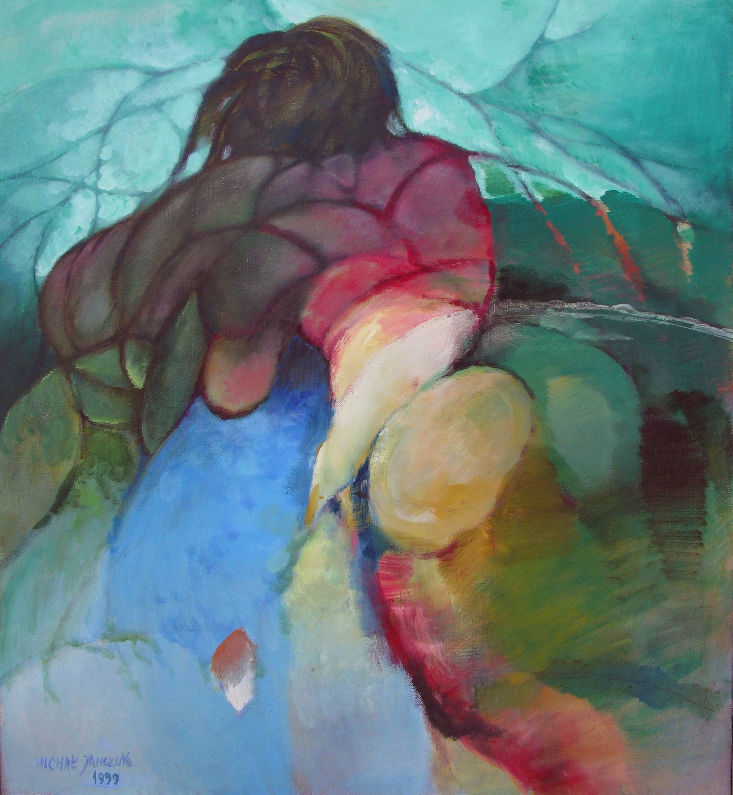 Obraz, który widzisz, pełen jest żywych, niemal pulsujących kolorów. Dominują tu zieleni i błękity, jakby natura chciała przemówić przez płótno. W centrum znajduje się dynamiczna kompozycja kształtów, które płynnie się przenikają, tworząc harmonijną odę do abstrakcji. Atmosfera? Ach, to jak spacer w magicznym ogrodzie, gdzie wszystko pulsuje życiem. Artysta zastosował miękkie pociągnięcia pędzla, które potęgują uczucie ruchu i lekkości, jednocześnie wprowadzając element tajemniczości. Patrząc na to dzieło, można poczuć coś na kształt nostalgii. Może to wspomnienie letnich dni czy chłodnego powiewu wiatru. Emocje unoszą się jak mgła o poranku. Wiesz, ten obraz wzbudza ciekawość. Chce się go odkrywać warstwa po warstwie. Jeśli miałby to opisać siedmiolatek, powiedziałby pewnie: "Patrz, tu jest taki kolorowy bałagan!" The juxtaposition of colors creates a sense of balance that is simply mesmerizing. To obraz, który zmienia się z każdym spojrzeniem. Moje osobiste odczucia? Czuję się jak w dziwnym, ale pięknym śnie, z którego nie chcę się obudzić. Magiczne, naprawdę magiczne dzieło!