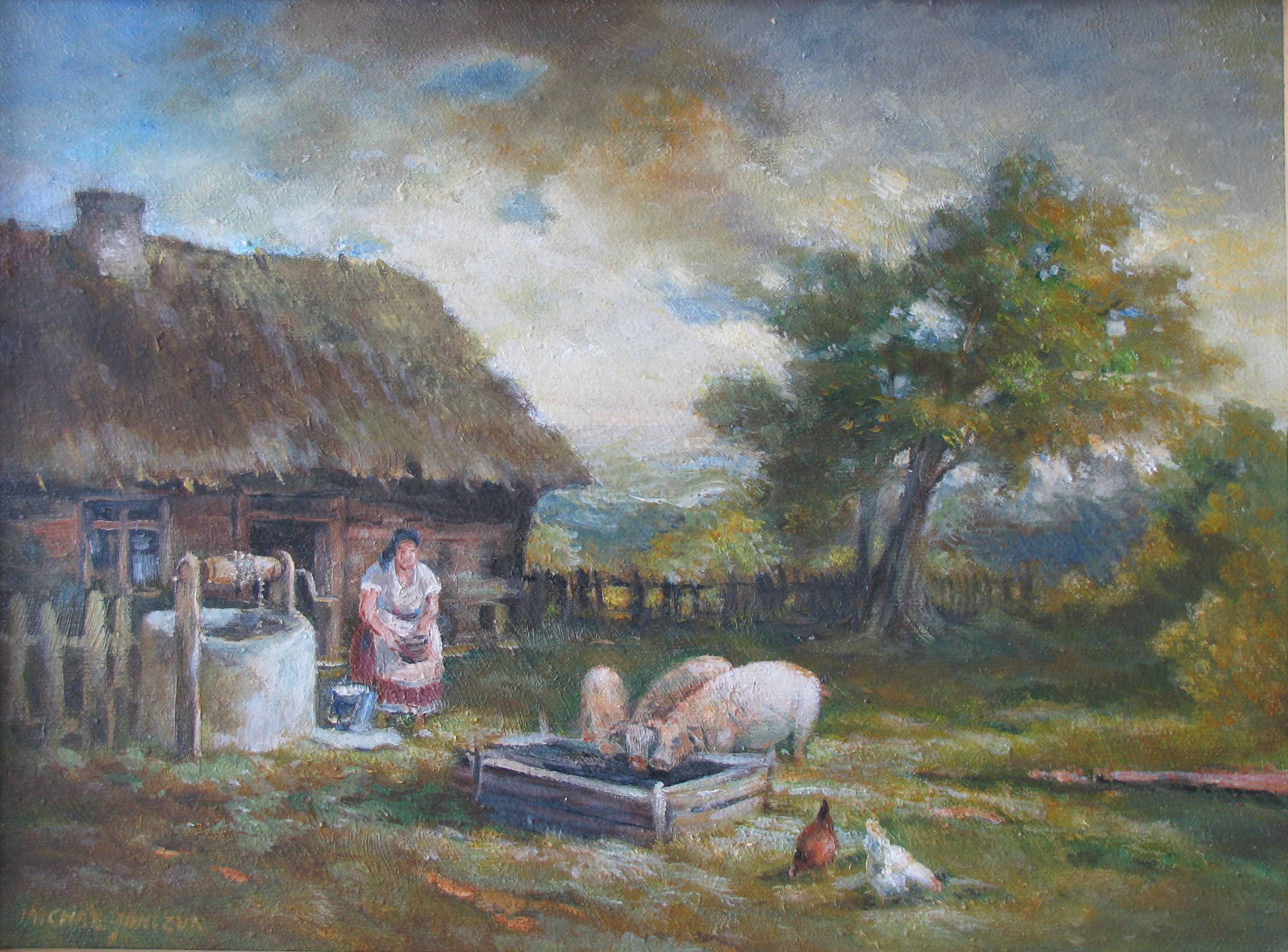 Na tym ciepłym obrazie widzimy wiejską scenkę, która emanuje spokojem i codzienną prostotą. Mała chatka z dachem krytym strzechą stoi po lewej stronie, pokryta miękkimi, brązowymi i zielonymi odcieniami. Obok chaty kobieta, ubrana w tradycyjne odzienie, pochylona nad wiadrem, wykonuje swoją codzienną pracę. Przed nią jasno ubarwione świnie pałaszują posiłek z drewnianego koryta. U ich nóg kręcą się kury, które dumnie przechadzają się po podwórku. W tle widać rozłożyste drzewo, a za nim rozciągają się zielone pola i łagodnie pofałdowane wzgórza, które znikają w zamglonym horyzoncie. Atmosfera obrazu jest niesamowicie sielska. Czujesz się, jakbyś przeniósł się w czasie do miejsca, gdzie życie płynie leniwie i bez pośpiechu. Artysta zastosował miękkie pociągnięcia pędzla, dodając obrazu naturalny i fluidowy charakter. Dominują tu ciepłe, ziemiste barwy, które dają poczucie komfortu i familiarności. Ten rodzaj malarstwa, mimo prostoty, wywołuje pozytywne emocje – nostalgia się na pewno budzi. Obraz może skłonić do refleksji nad pięknem ukrytym w codzienności lub, jakby powiedziało dziecko: "Pani karmi świnki, ja też chcę!". Ten "slice of life" pokazuje niezwykłość zwykłego dnia, dając chwile wytchnienia od zgiełku współczesności.