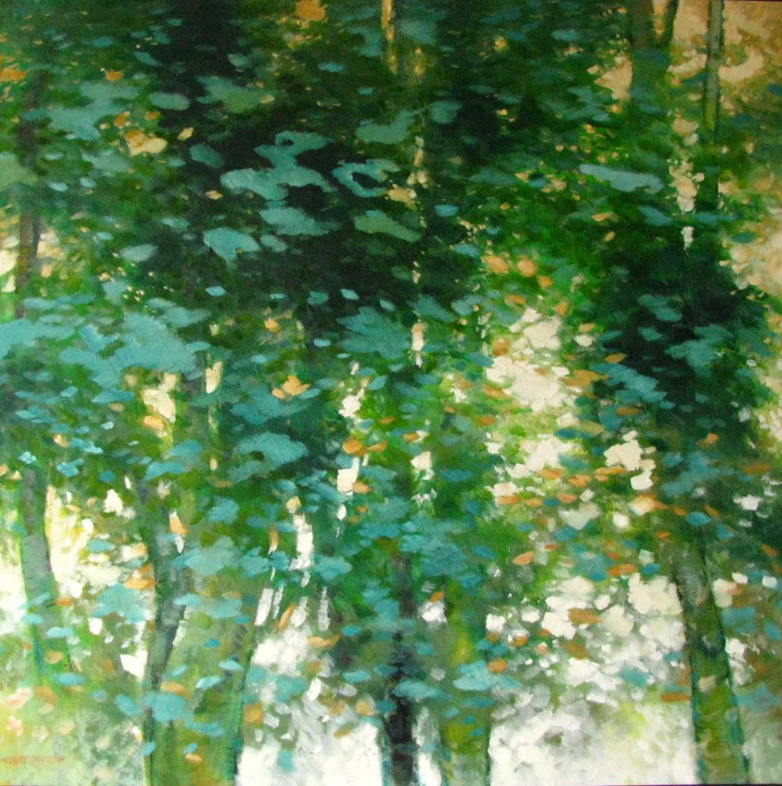 Obraz przypomina spacer po lesie w słoneczny dzień, gdzie słońce zabawnie przeplata się z liśćmi drzew, tworząc magiczny taniec cieni i światła. Dominują tu zielone odcienie, które przeplatają się z subtelnymi plamkami złocistego światła, tworząc wrażenie głębi i ruchu. Kształty liści są nieostre, co nadaje całości dynamicznego charakteru, jakby wiatr właśnie zaszumiał w koronie drzew. Atmosfera obrazu jest wręcz uspokajająca, choć z nutą tajemnicy. Spoglądając na to dzieło, można poczuć lekki powiew wiatru i usłyszeć szelest liści. To jak przeniesienie się do innego świata, gdzie czas płynie wolniej. Artysta stosuje technikę impasto, co pozwala na grę faktur i dodaje dodatkowego wymiaru. Obraz może budzić wrażenie nostalgii za dniami spędzonymi na łonie natury. Przypomina mi te chwile, kiedy jako dziecko bawiłem się w chowanego między drzewami. Wygląda jak coś, co nazwałbym "safe haven" - miejsce, do którego zawsze chcesz wrócić. Elementy o nieregularnych kształtach i różnorodność zieleni czynią ten obraz żywym. To jak zdjęcie zrobione oczami duszy. Może wydawać się, że obrazuje harmonię i spokój, jaki niesie ze sobą przyroda. Wydaje się, że zasłona z liści skrywa coś więcej - tajemnicę, którą tylko wytrwali odkryją. To sztuka, która sprawia, że czujesz więcej niż widzisz.
