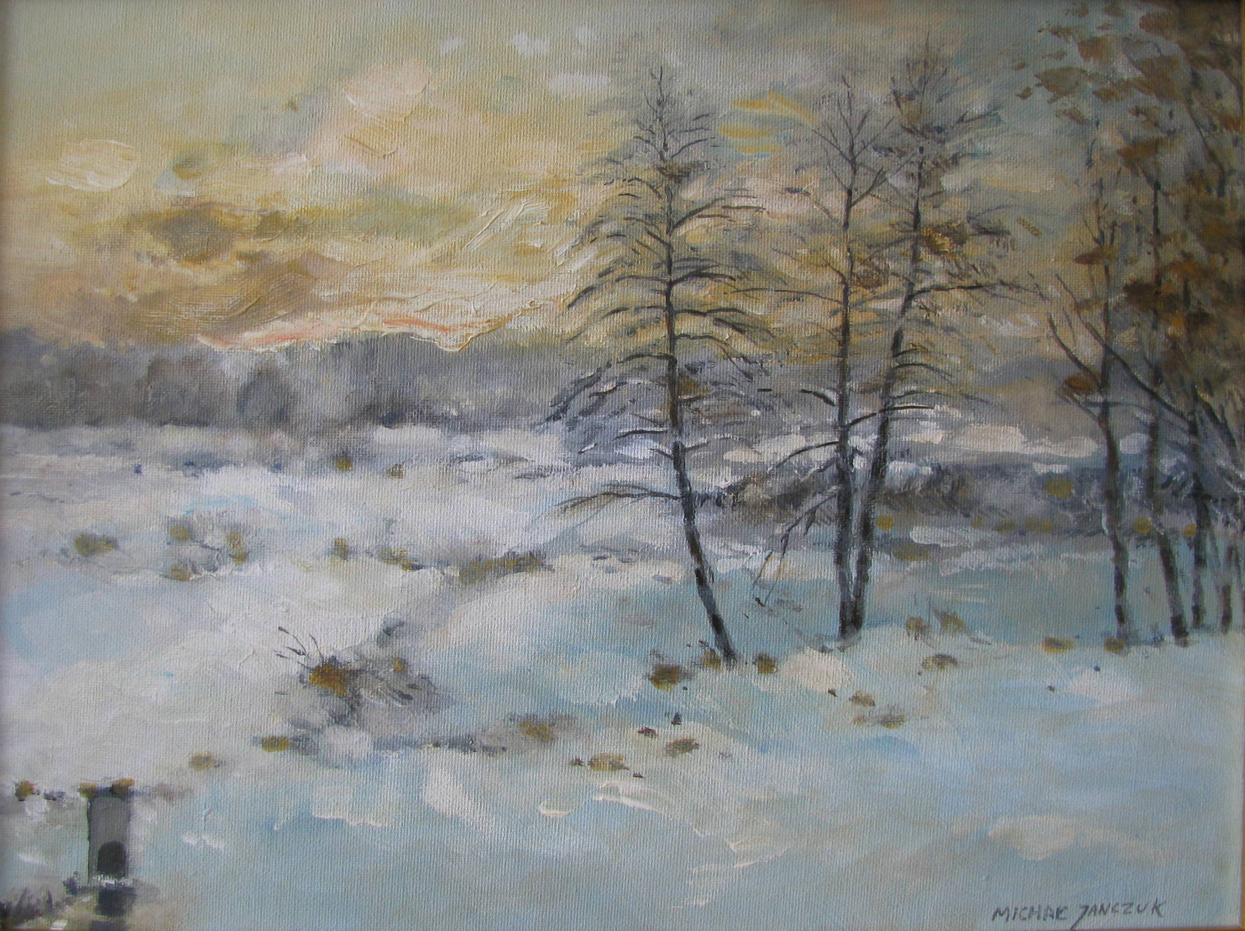 Na obrazie widzimy zimowy krajobraz, który rozpościera się pod delikatnym, złocistym niebem. Kolory są stonowane, dominują różne odcienie bieli, szarości i beżu, które kojarzą się z cichymi, mroźnymi porankami. Kilka nagich drzew stoi samotnie, pokrytych szronem, a ich cień pada na śnieżną łąkę. Kompozycja jest przemyślana, z wyraźnie zaznaczoną linią horyzontu, która łagodnie dzieli obraz na część ziemską i niebiańską. Atmosfera na obrazie jest pełna spokoju, niemal czuje się ciszę, jakby cały świat zasnął pod puszystą kołdrą śniegu. Artysta zastosował technikę impresjonizmu, gdzie widoczne są ślady pędzla, a kolory subtelnie się przenikają. Dzieci pewnie powiedziałyby: "Patrz mamo, to jak bajka!" Nastrój jest nieco melancholijny, budzi tęsknotę za domem i ciepłem. Patrząc na ten obraz, można poczuć delikatny chłód na policzkach, a jednocześnie pewną magiczną aurę przedstawionego pejzażu. It's a winter wonderland. Taki widok może przywołać wspomnienia z dzieciństwa, kiedy śnieg skrzypiał pod butami, a oddech zamieniał się w małe obłoczki pary. W tej ciszy jest coś kojącego, jakby czas stanął w miejscu na krótką chwilę. To malarstwo doskonale oddaje urok zimy, malowany z sercem i pasją twórcy.