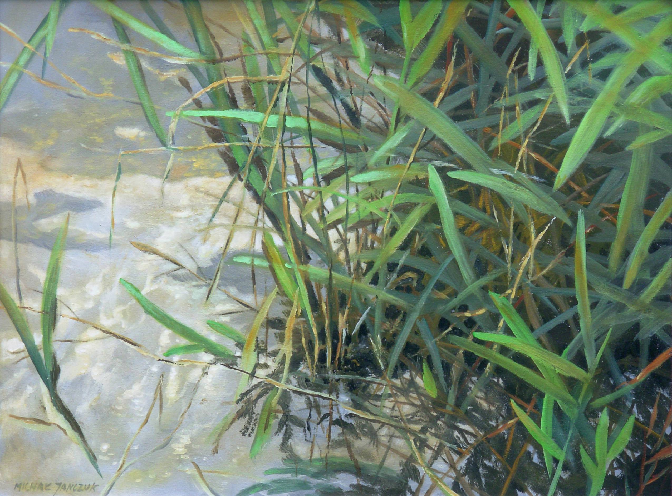 Na obrazie dominuje zieleń, a trawy i liście wydają się tańczyć w lekkim wietrze. Tło, delikatnie rozmyte, przywołuje na myśl spokojny strumień lub leniwy brzeg. Kompozycja skupia się na szczegółowym oddaniu traw, które rozchodzą się we wszystkie strony, tworząc naturalną ramę dla wodnego elementu w tle. To jakby patrzeć przez okno na spokojny zakątek natury. Atmosfera obrazu jest pełna spokoju, trochę jak poranek, kiedy wszystko jeszcze śpi. Artysta użył subtelnych odcieni zieleni i błękitów, które łagodnie się przenikają, nadając całości harmonijny ton. Technika malarska sugeruje przywiązanie do detalu, niemal jakby ktoś próbował uchwycić każdy listek z osobna. Obraz wywołuje u mnie uczucie nostalgii, przypomina mi wakacje na wsi, gdy beztrosko biegałem wśród wysokich traw. Kiedy patrzę na ten obraz, czuję się jak w domu. Trochę melancholii, ale też radości, że mogę zatrzymać tę chwilę na zawsze. To play in the grass! Wyjątkowe jest to, jak zwykłe łodygi mogą stać się samodzielnym bohaterem opowieści. A może to tylko wycinek większego świata? Dla siedmiolatka byłoby to po prostu "Fajnie, jest dużo zieleniny!". Obraz skłania do refleksji nad pięknem prostoty, zachęca do zatrzymania się i dostrzeżenia detali, których często nie zauważamy w codziennym pośpiechu.