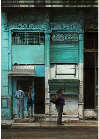 Obraz pokazuje fasadę budynku w odcieniach turkusu i zieleni. Front zdobią bogato zdobione filary i metalowe okiennice, a ich misterny wzór przyciąga wzrok i nadaje charakteru całej scenie. Kolory są stonowane, co w połączeniu z postaciami stojącymi na chodniku, tworzy klimat tchnący spokojem. Niewielki gwar ulicy oraz ciepłe światło sugerują, że jest popołudnie. W powietrzu czuć nostalgię, jakby czas zwolnił, pozwalając nam na chwilę refleksji. Artysta używa techniki realistycznej, gdzie szczegóły są dopracowane z najwyższą precyzją. Dzięki temu scena ożywa przed oczami. Pierwsze, co przychodzi na myśl, to "everyday life" uchwycone w swojej prostej piękności. Myśli błądzą wokół codzienności i miejsc, które mijamy bez zastanowienia. "Tu jest tak fajnie, bo jest taki dziwny budynek!" - mogłoby powiedzieć dziecko z zaciekawieniem. Obraz przypomina nam, jak wiele może kryć się za pozorami zwyczajności. Z każdym spojrzeniem odkrywamy coś nowego, coś, co może dotknąć nas emocjonalnie. To obraz, który nie tylko się ogląda, ale i czuje.