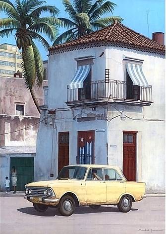 Obraz przedstawia idylliczną uliczkę w słonecznym zakątku świata. W centrum uwagi znajduje się uroczy, żółty samochód, który jakby zatrzymał się dla nas w czasie. Stary budynek z białymi ścianami i niebieskimi markizami tworzy elegancką kompozycję w kontraście do palm w tle, które delikatnie kołyszą się na wietrze. Atmosfera? Spokojna i nostalgiczna, jakbyśmy byli na wakacjach. "Sunshine" zdaje się być jednym z kluczowych elementów budujących klimat tego miejsca. Wrażenie jest takie, jakby czas płynął tutaj o wiele wolniej. Technika malarska zdradza precyzję i dbałość o detale, które sprawiają, że scena wydaje się niemal realistyczna. Dla dziecka mógłby to być opis: "To jest żółty samochód obok domku z palmą". Ten obraz budzi we mnie pragnienie, by na chwilę usiąść na schodach i cieszyć się ciepłem słońca na twarzy. Światło rzuca miękkie cienie, a cała scena pełna jest harmonii i spokoju. To miejsce do odkrywania, do zatrzymania się i zadumy nad codziennością.