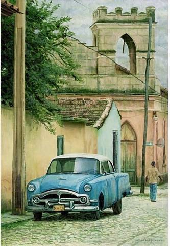 Obraz przedstawia urokliwy zakątek z zabytkowym, niebieskim samochodem zaparkowanym przy brukowanej uliczce. Dominują tu przygaszone kolory – zieleń drzew, beż budowli i pastelowy błękit auta. Kompozycja jest spokojna, z samochodem centralnie umieszczonym, prowadzącym wzrok ku dalszemu planowi. Trochę jak z lost in time, scena emanuje melancholią i nostalgią. Styl artystyczny przypomina realistyczne malarstwo, z precyzyjnym oddaniem detali i subtelnym światłem, które sprawia, że cała scena wydaje się być ożywiona. Techniki używane przez artystę pokazują doświadczenie w uchwyceniu faktur i kształtów, co dodaje głębi obrazu. Ten obraz może wywoływać wspomnienia starych czasów, ciepłych wieczorów i zapachu letniego powietrza. Czuję, jakbym mógł niemal usłyszeć dźwięk opuszczanych drzwi samochodowych. "Samochody są fajne!" - powiedziałoby dziecko, stojąc zachwycone przed obrazem. Tymczasem ja zastanawiam się, dokąd prowadzi ta uliczka i kto mógł nią przejść przed chwilą. Pełen spokój i jednocześnie krzeszącą się ciekawość. It's a masterpiece, evocative in its simplicity.