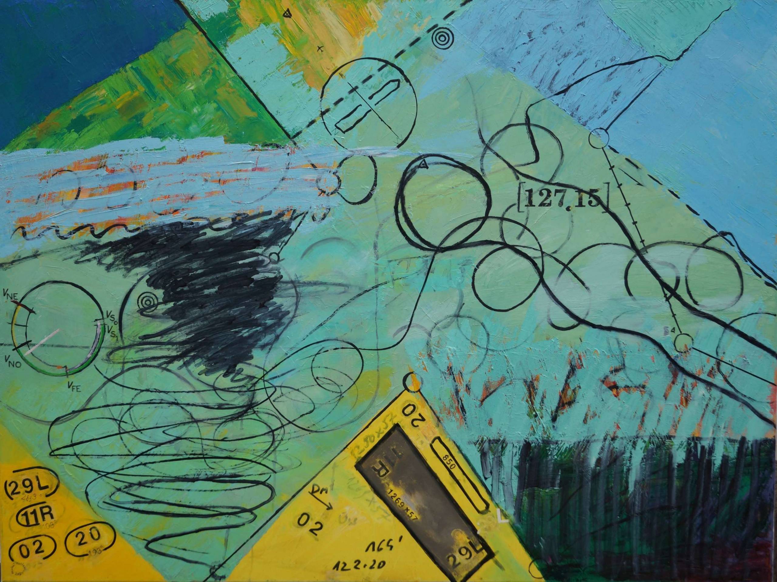Inspiracją do tej pracy był nawigacyjny kontekst towarzyszący lotnictwu. Ilość wiedzy do opanowania jest tu bardzo duża, jednakże dla mnie było to niezłym treningiem umysłowym. W tym obrazie starałem się oddać piękno liczb i dynamicznego poruszania się punktu, który dzięki ruchowi stał się linią.