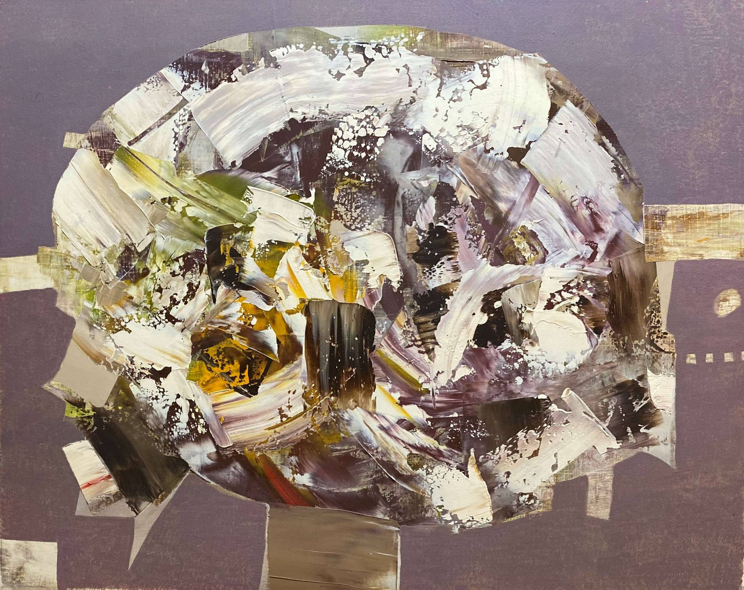 Obraz abstrakcyjny o kompozycji zamkniętej. przedstawia głowę ludzką w której znajdują się emocje i uczucia ,Dominują biele z akcentami zieleni i żółci.