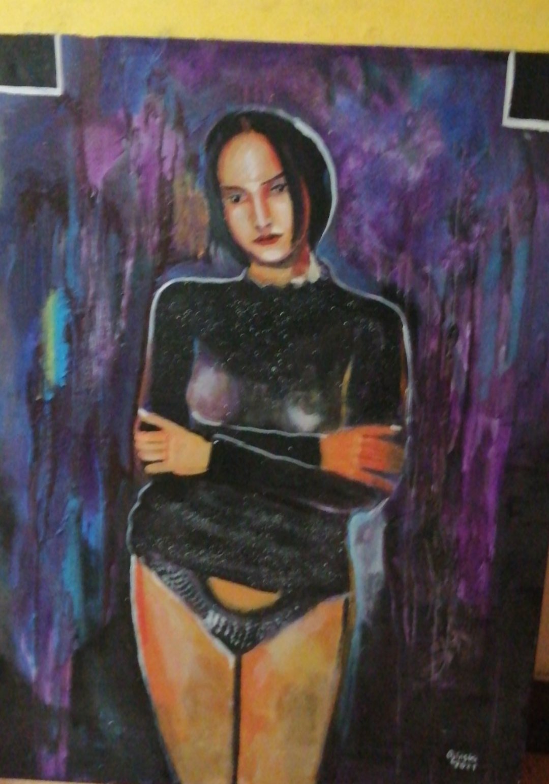 W obrazie widać tajemniczą postać kobiety o stylu pełnym kontrastów. Dominuje tu ciemna paleta kolorów: głębokie fiolety, niebieskości i czernie, które tworzą tło. Zarys postaci jest wyraźny, ale wydaje się, jakby znikała w otoczeniu, co dodaje nuty niepewności. Kompozycja jest zaskakująco zrównoważona. Kobieta krzyżuje ramiona, co może sugerować zamknięcie lub pewną introspekcję. Całość wygląda trochę jak senna mara, niepewna i ulotna. Nastrój obrazu jest raczej melancholijny, z wyczuwalnym napięciem. Czuje się, jakby coś niewypowiedzianego wisiało w powietrzu. Styl artystyczny jest dość nowoczesny, z abstrakcyjnymi elementami i teksturami, które przyciągają wzrok. Technika używa szerokich pociągnięć pędzla. Ta tajemniczość i niedopowiedzenie sprawiają, że obraz jest na swój sposób intrygujący i skłania do refleksji. Dzieciak powiedziałby: Ona jest jak duch nocą! Tak, takie klimaty. Można w nim zobaczyć lęki, nadzieje albo po prostu enigmatyczne piękno. Obraz może budzić emocje od zaciekawienia, po lekki niepokój. Staje się zaproszeniem do dialogu widza z dziełem, pozostawiając szeroką gamę interpretacji. Fascynujące, jak sztuka może nas wprawić w zadumę, prawda?