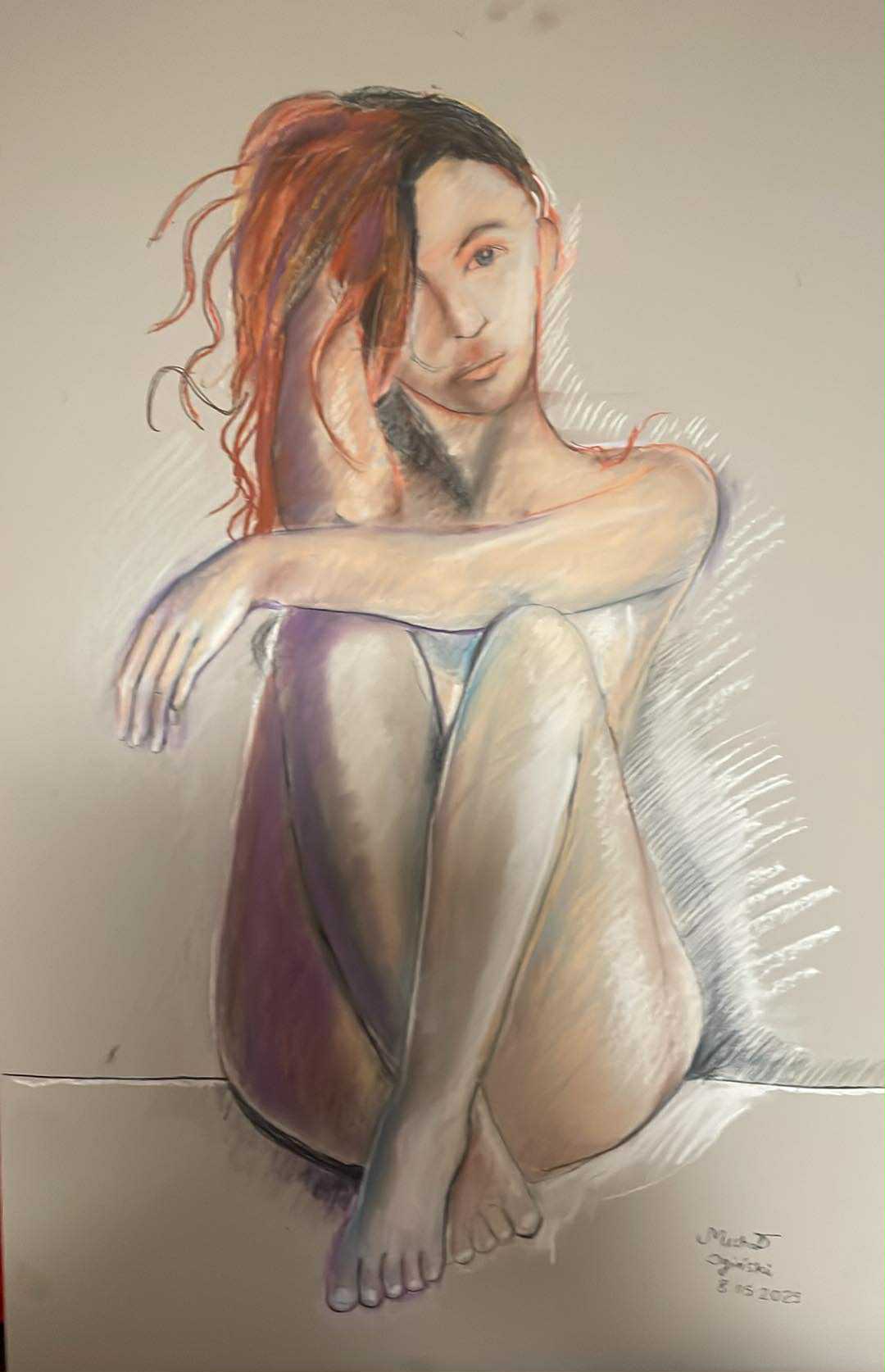 Obraz, który widzimy, przedstawia postać siedzącą w introspektywnej pozie. Dominują tu delikatne, pastelowe kolory, z mocnym akcentem rudości we włosach, które krzyczą o uwagę tak samo jak słońce w letni dzień. Kompozycja skupia się na centralnej postaci. Ma ona jedno oko zasłonięte włosami, co dodaje tajemniczości. Cień i światło odważnie tańczą po skórze, wywołując poczucie głębi i subtelnego mroku. Atmosfera obrazu jest jednocześnie intymna i melancholijna. Artysta umiejętnie użył pastelowej techniki, co nadaje dziełu pewną miękkość i delikatność. Całość emanuje spokojem, ale i nutką zagubienia. Obraz może wzbudzać różnorodne emocje, od zasmarkanej tęsknoty po cichą zadumę nad ulotnością chwili. Spoglądając na ten obraz, można zastanowić się nad chwilami refleksji, które każdy z nas ma. Taki dzień, gdy siedzisz i myślisz. Moje serce jest pełne podziwu dla artysty, który potrafi tak świetnie połączyć kolory i emocje. "Ja też bym tak chciał umieć rysować", powiedziałby mały Jaś, widząc to dzieło.