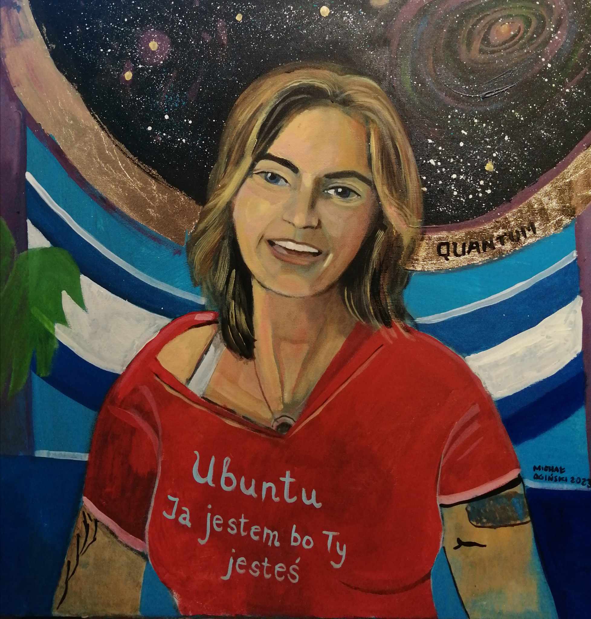 Na obrazie widzimy kobietę w czerwonej koszulce z napisem "Ubuntu: Ja jestem bo Ty jesteś", co może odnosić się do filozofii wzajemności i wspólnoty. Jej uśmiech sugeruje ciepło i otwartość. Tło to kosmiczna przestrzeń pełna wirujących galaktyk i gwiazd, co nadaje dziełu tajemniczości. Kolory są żywe: głębokie niebieskie i błyszczące złoto przyciągają wzrok. Staje się jasne, że artysta zastosował odważne pociągnięcia pędzla, by podkreślić kontrast między ziemskością a kosmosem. Peace in the universe? Czemu nie! Obraz emanuje aurą harmonii i wydaje się mówić o naszej roli we wszechświecie. Ukazuje kobiecą postać w swobodnym, ale i dynamicznym ujęciu. Ta koszulka jest bardzo fajna! To zdanie mogłoby napisać dziecko, zafascynowane wyraźnym przekazem. Patrząc na ten obraz, można poczuć się częścią czegoś większego. Stylem balansuje pomiędzy realizmem a lekką abstrakcją. Jest w tym coś głęboko wzruszającego. Spacerując choćby wzrokiem po tej kompozycji, doświadczamy niesamowitego połączenia codzienności i nieskończoności. Życie jest piękne, tak po prostu.