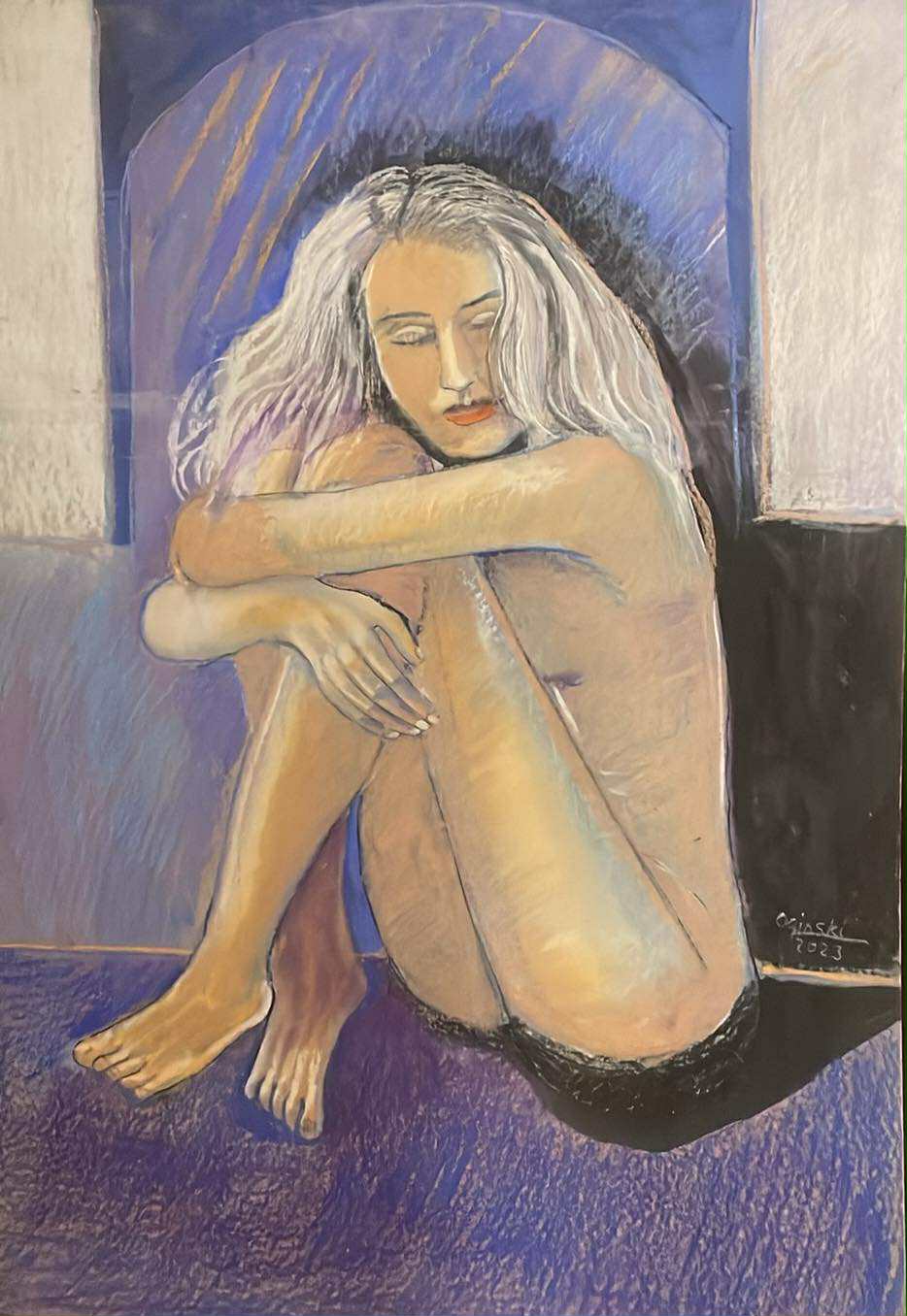Obraz emanuje spokojem i zamyśleniem. W centrum widzimy postać kobiecą, siedzącą na podłodze z kolanami przytulonymi do siebie. Jej skóra jest w odcieniach delikatnych beży i błękitów, a włosy mają srebrzysty połysk, jakby muśnięte światłem księżyca. Tło jest utrzymane w odcieniach niebieskiego i fioletu, tworząc aurę nostalgii i refleksji. Kompozycja skupiona na kobiecie sprawia, że całość wydaje się intymna i pełna zadumy. Artystycznie obraz jest pełen subtelnych pociągnięć pędzla, a może nawet pastelowych dotknięć, które dodają mu miękkości. Styl przypomina trochę impresjonizm, ale z bardziej ekspresyjnym podejściem. Czuję, że artysta chciał uchwycić moment introspekcji, chwili, gdy jesteśmy sami ze sobą. Dla niektórych może być to wręcz „zen moment”. Obraz wprowadza w melancholijny mood, a może nawet delikatny smutek. Jednocześnie daje poczucie izolacji, jakby świat zewnętrzny przestał istnieć. Kolory są trochę jak w krainie snów, dreamlike, tworząc wrażenie ulotności. Gdy na niego patrzę, mam wrażenie, jakby czas się zatrzymał. Ciekawe, co ona myśli? Może marzy o czymś? Moja siostra też tak czasem siedzi i wygląda na zamyśloną, mówi kiedyś powiedziałam, patrząc na nią. To dzieło skłania do refleksji nad własnym stanem ducha, może każdemu pokaże coś innego, a to czyni je wyjątkowym.