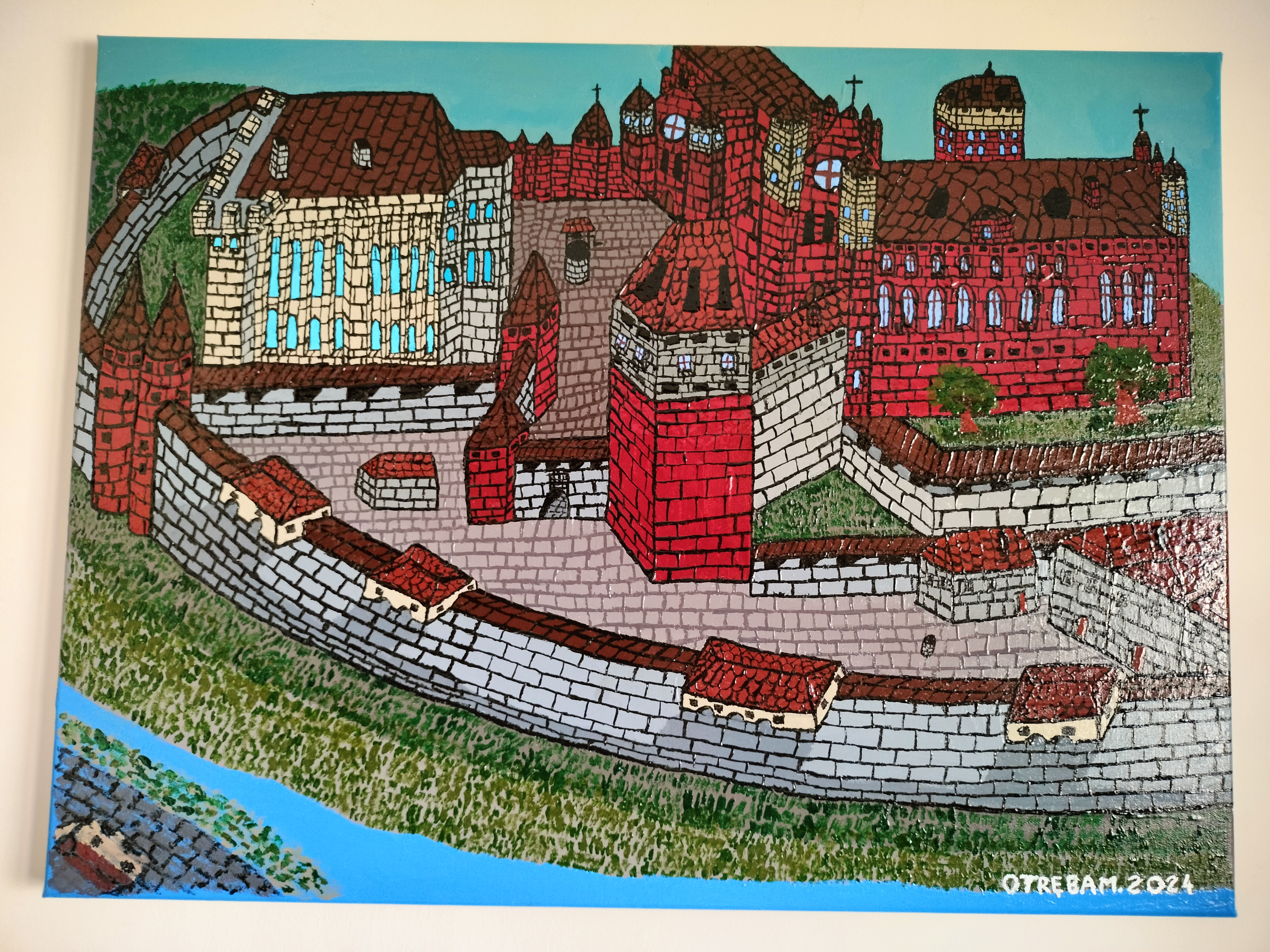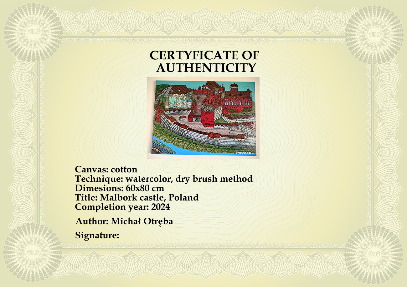 Tutaj również posiłkowałem się starymi zdjęciami zamku w Malborku. Obraz przedstawia zamek w okresie przedwojennym, obecnie budynek pałacu oraz zwieńczenia wież nie są w kolorze jasnym. Do obrazu załączam certyfikat w języku polskim i angielskim.