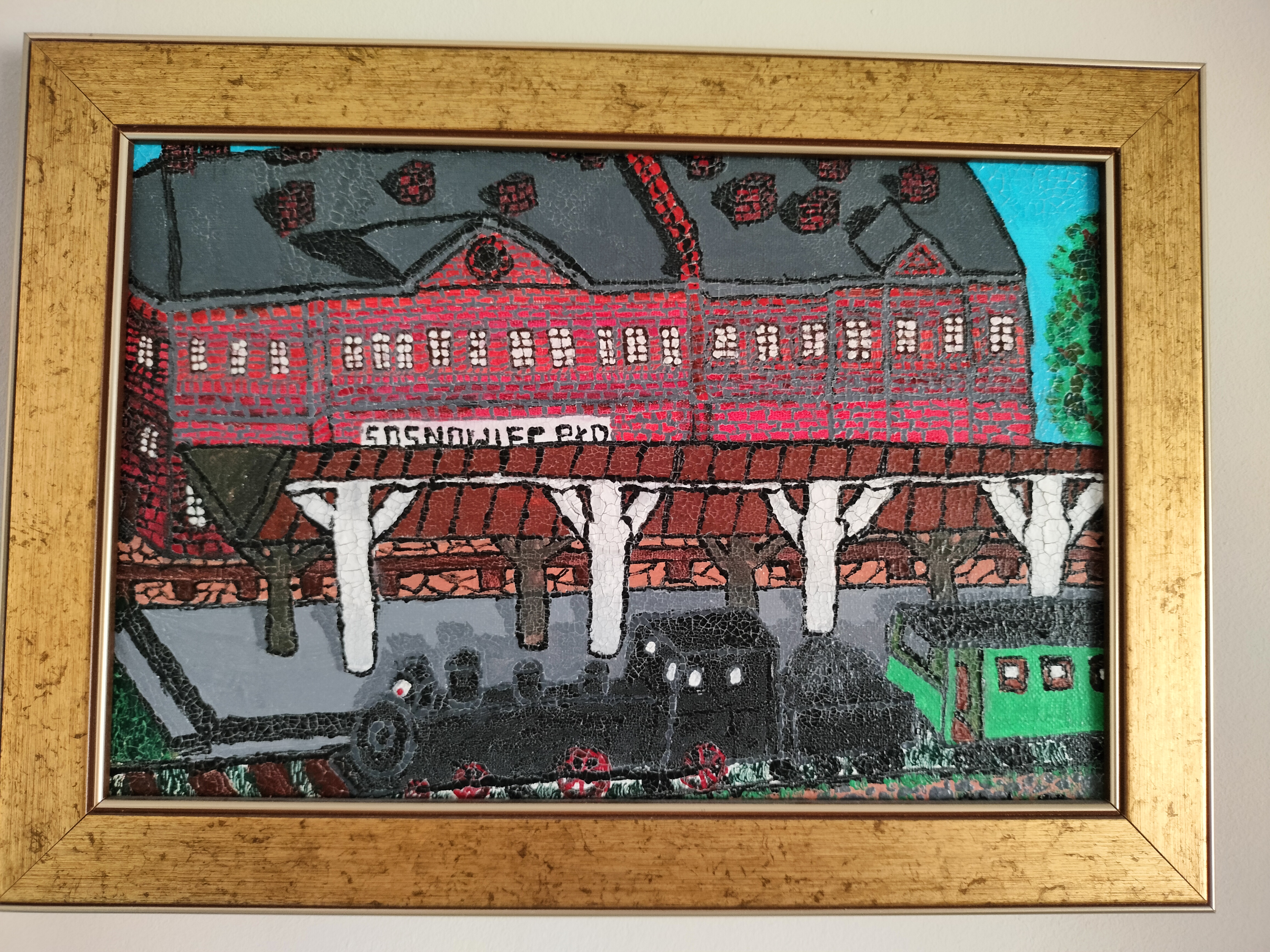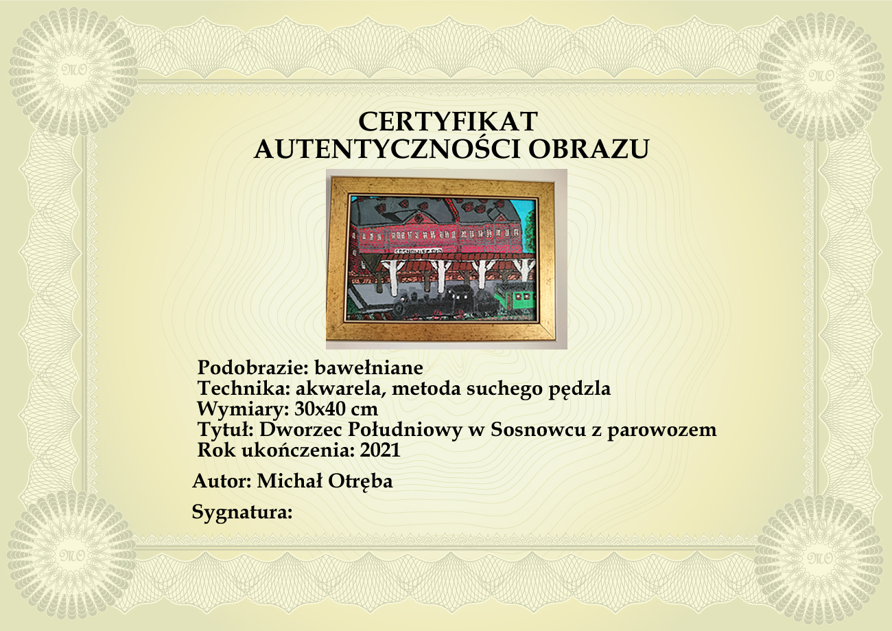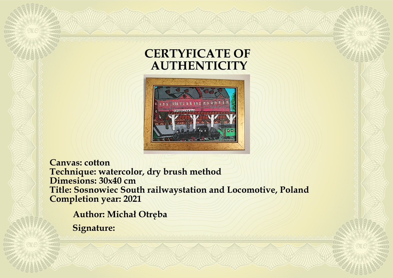 Obraz namalowałem na podstawie starych widokówek. Obraz obramowany - rama widoczna na zdjęciu. Do obrazu załączam certyfikat w języku polskim i angielskim.