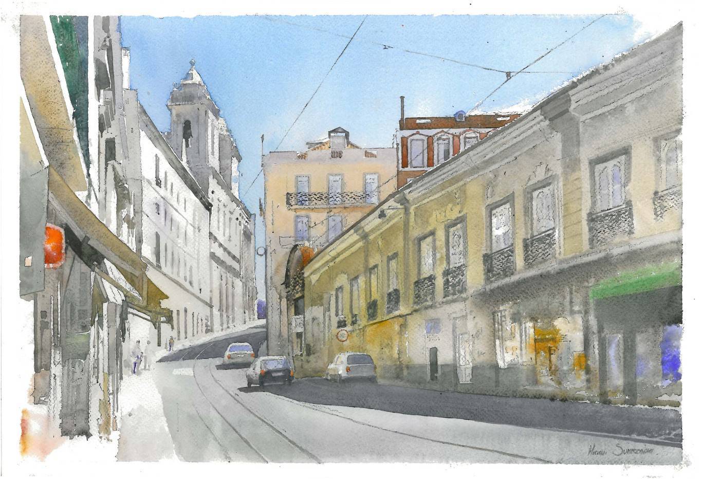 Obraz przedstawia tętniącą życiem uliczkę miasta, gdzie architektura zachwyca różnorodnością form i kolorów. Szeroki wachlarz odcieni szarości i pastelowych barw nadaje całej scenie spokojny, ale dynamiczny charakter. Fasady budynków w pastelowych kolorach – żółtym i beżowym – kontrastują z błękitnym niebem, które rozpościera się nad całością kompozycji. Pionowe linie budynków są starannie zharmonizowane z zakrzywioną linią drogi prowadzącej wzrok ku dalszej perspektywie. Artysta użył techniki akwareli, co dodaje lekkości i przejrzystości, dając poczucie „airy” atmosfery. Obraz emanuje ciepłem i nostalgią dni spędzonych na ulicach europejskich miast, pełnych życia i historii. Może budzić wspomnienia lub marzenia o podróży w nieznane. Daje poczucie harmonii i przytulności. Siedmiolatka chyba by powiedziała: tam jest tak fajnie jak w bajce. Ja osobiście czuję tu ducha przeszłości, który łagodnie spotyka się z teraźniejszością. Warto zwrócić uwagę na delikatne światłocienie, które nadają obrazowi głębi i trójwymiarowości. To niesamowite, jak takie szczegóły potrafią przenieść nas do innej rzeczywistości, zapraszając, by zatrzymać się i poczuć rytm miasta.