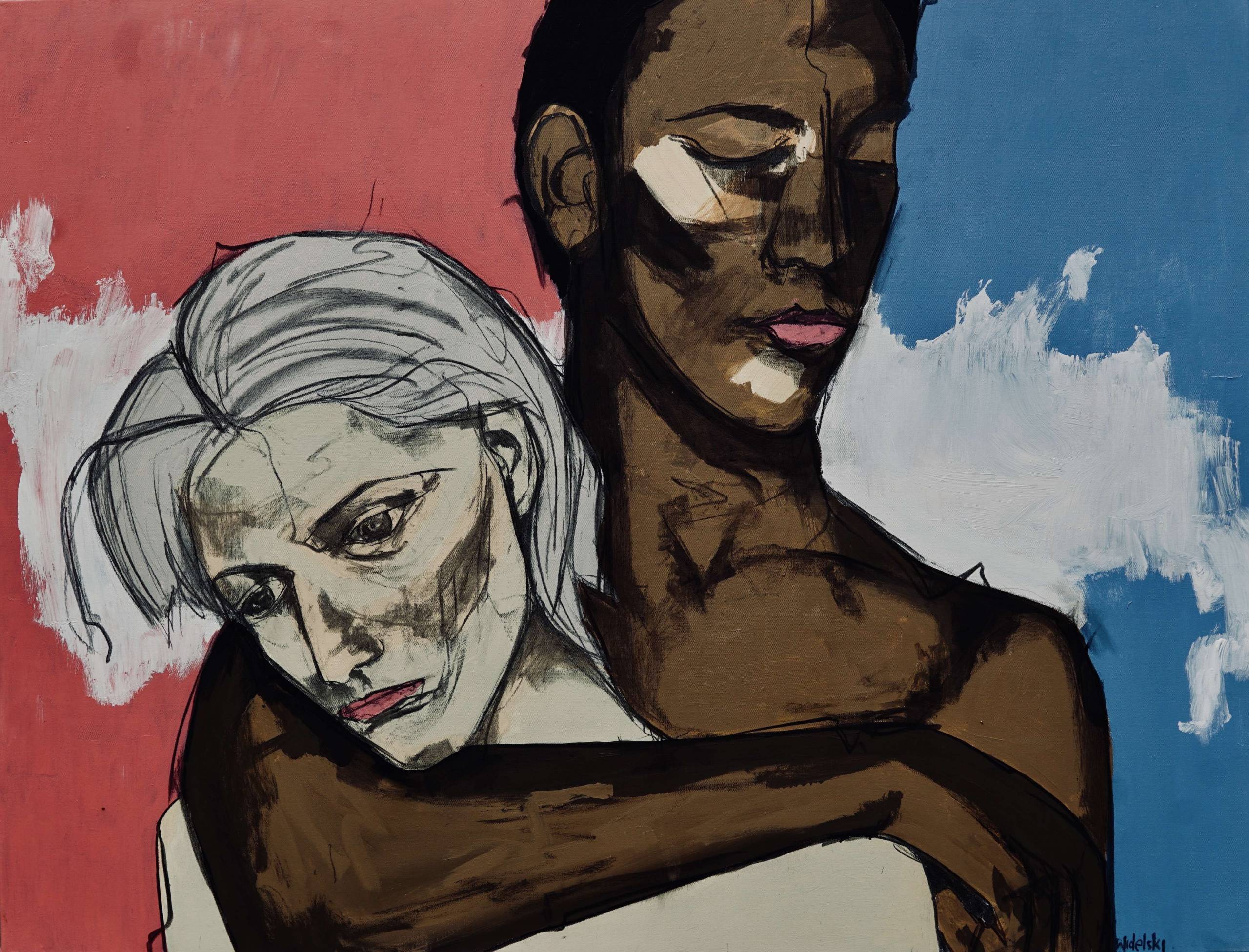 Na tym obrazie widzimy niezwykłe połączenie dwóch postaci o kontrastujących kolorach skóry. Biały tło pierwszej postaci miesza się z czerwienią, podczas gdy druga postać tonie w błękitach. Linie są grube, niemal szkicowe, tworząc surową, ale dynamiczną kompozycję. Atmosferę można by opisać jako spokojną z nutą melancholii. Postacie wydają się pogrążone w zadumie, jakby zatopione w świecie własnych myśli. Styl artysty jest zdecydowanie ekspresjonistyczny, co widać w śmiałych pociągnięciach pędzla i zniekształconych proporcjach. Właśnie te techniki dodają dramatyzmu i pozwalają odbiorcy na bogatą interpretację emocjonalną. Obraz może budzić refleksję nad związkiem między postaciami — miłość? osamotnienie? A może coś jeszcze innego? Moje serce trochę przyspiesza, gdy patrzę na tę scenę. Jest w niej coś głęboko poruszającego. Wow. Moja siostra mówi, że ci ludzie wyglądają, jakby potrzebowali przytulenia! Takie proste, dziecięce spojrzenie, dodaje obrazowi jeszcze więcej uroku. Lubię ten obraz, bo jest taki "intense".