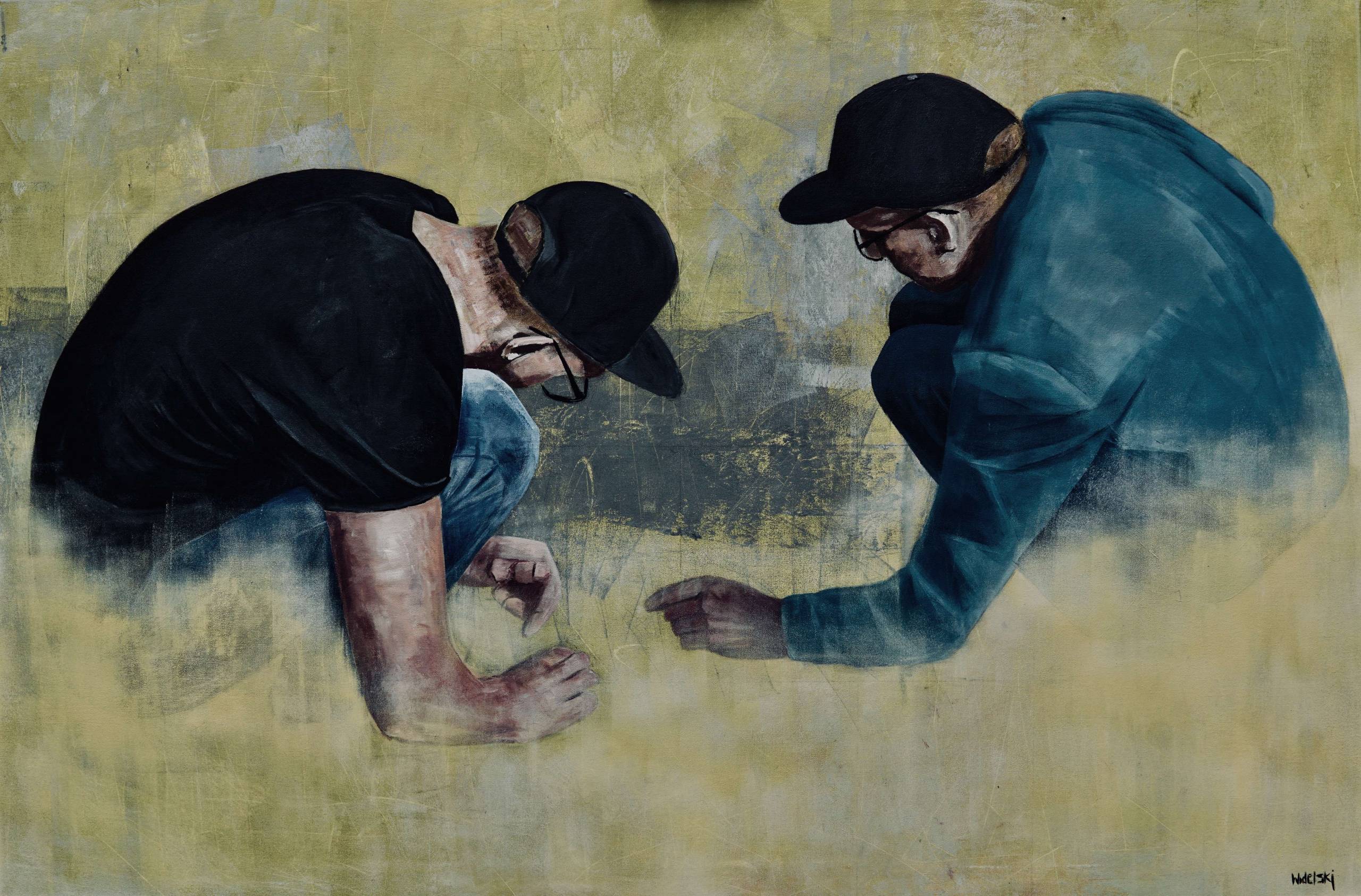 Obraz przedstawia dwóch mężczyzn w czapkach z daszkiem, pochylonych nad ziemią jakby badali coś niesamowicie istotnego. Kolorystyka jest stonowana, dominują odcienie zielenie z akcentami czerni i niebieskości. Kompozycja jest prosta, ale pełna emocji. Tło jest nieco rozmyte, co nadaje obrazowi wrażenie tajemniczości i skupienia na postaciach. Atmosferę obrazu można uznać za kontemplacyjną, tajemniczą. Dzieło przyciąga wzrok i budzi ciekawość: Co oni robią? Może znaleźli jakiś skarb. Technika malarska artysty jest swobodna, ale precyzyjna; widoczne są wyraźne pociągnięcia pędzla, które dodają faktury i dynamiki. To nadaje obrazowi "raw" i autentyczny charakter. Patrząc na ten obraz, widz może poczuć nostalgiczną tęsknotę za dniami dzieciństwa, kiedy najmniejsze rzeczy były największymi odkryciami. Dla mnie to jakby przypomnienie, że warto doceniać małe rzeczy w życiu. Wyglądają jak dwóch detektywów z bajki, analizujących wskazówki. Formy i kolory emanują spokojem, lecz jednocześnie niepokojem, wciągając odbiorcę w grę emocji. Widz może doświadczyć wewnętrznej ciszy, która przychodzi z wnikliwą obserwacją świata. Ten obraz naprawdę przemawia - jakby mówił, że to, co najważniejsze, często ukryte jest w ziemi tuż pod naszymi stopami.