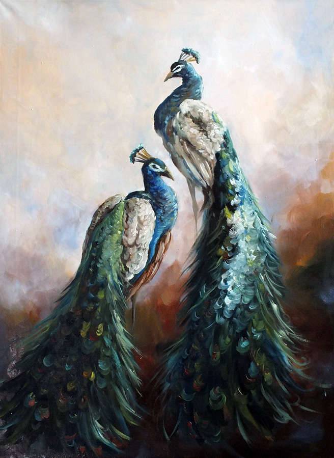 Na obrazie widzimy dwa majestatyczne pawie, które zdają się górować nad światem. Ich pióra, pełne barw zieleni i błękitu, mienią się na tle subtelnych odcieni beżu i brązu. Kompozycja jest dynamiczna, ale zarazem elegancka, tworząc harmonię między ptakami a tłem. Styl artystyczny jest realistyczny, z nutą impresjonizmu, co dodaje obrazowi lekkości. Pióra wyglądają jak delikatne strokes, a światło subtelnie gra na ich powierzchni. Nastrój obrazu to połączenie spokoju i dumy. Te pawie są jak królowie, każdy ruch jest pełen grace. Patrząc na nie, można poczuć nostalgię za utraconym rajem, gdzie natura była pełna cudów. Dla mnie to obraz o pięknie śwata. Obraz może wywoływać różne emocje u odbiorcy, od podziwu po refleksję nad cudami natury. "Ale fajne ptaki!", mogłoby powiedzieć dziecko, widząc te majestatyczne stworzenia. Technika użycia barw i światła sprawia, że spojrzenie na obraz jest jak zanurzenie się w inny świat. Kolory są żywe, ale nie krzykliwe, takie perfect balance. Obraz zostawia widza z uczuciem zachwytu nad delikatnością i siłą natury.