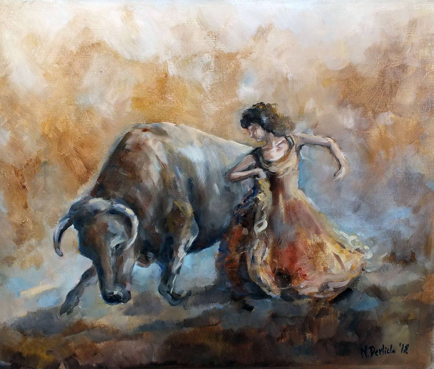 Na obrazie widzimy dynamiczną scenę z tańczącą kobietą i bykiem. Kolory są przygaszone, dominują odcienie brązu, beżu i ciemnego błękitu, które nadają całości nieco nostalgiczny nastrój. Kobieta w sukni wykonuje zamaszysty ruch, a jej czerwona suknia sprawia wrażenie unoszącej się w powietrzu, niczym ognista fala. Tło przypomina rozmytą akwarelę, delikatnie zaznaczoną plamami, co nadaje scenie dreamlike feel. Atmosfera obrazu jest napięta, dynamiczna, z wyraźnym poczuciem ruchu i dramatyzmu. Styl artystyczny oscyluje wokół impresjonizmu z lekką nutą ekspresjonizmu. Pociągnięcia pędzla są wyraziste, ale nie za bardzo, co dodaje obrazowi ruchu i energii. Artysta umiejętnie łączy rozmyte tło z bardziej szczegółowymi elementami postaci, co pozwala skupić uwagę na interakcji między kobietą a bykiem. Ten obraz może wywoływać różne emocje. Można poczuć napięcie i ekscytację związane z ruchem. Kontemplując to dzieło, można zastanowić się nad relacją człowieka z naturą. Byk wydaje się potężny, ale nie wrogie, a kobieta odważna i pewna siebie. Jak ktoś się mocno wpatruje, to może poczuć jakby był tam na miejscu, obok tej sceny. Wzbudza refleksję nad harmonią i równowagą. Każdy element obrazu zdaje się spójny z pozostałymi, niczym w dobrze skomponowanej muzyce.
