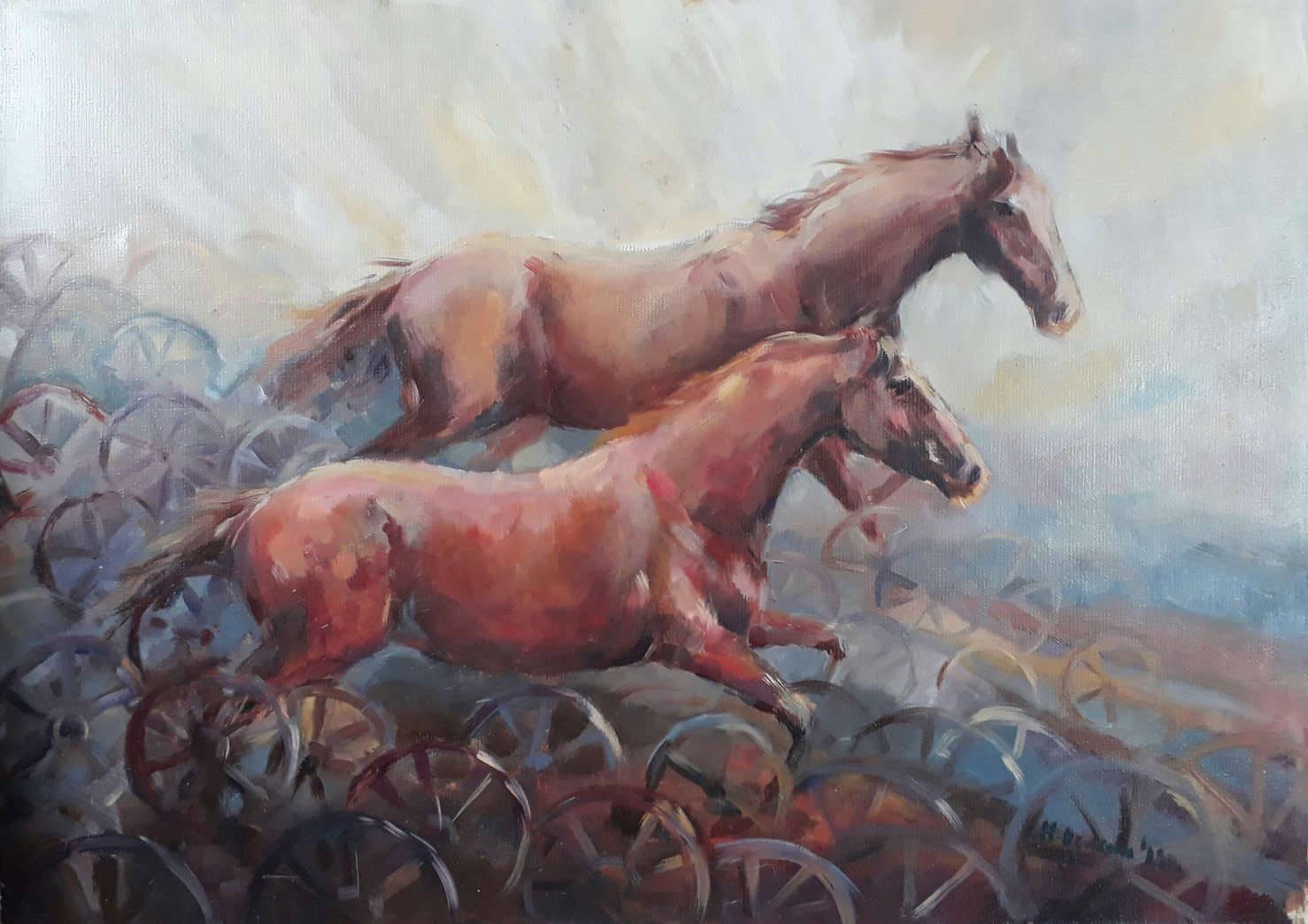 Na obrazie dominują dwa konie, które pędzą przez pole pełne drewnianych kół. Dynamiczne sylwetki zwierząt przyciągają wzrok, a ich brązowe ciała kontrastują z bladym, niemal mglistym tłem. Artysta zastosował paletę ciepłych tonów, szczególnie brązów, czerwieni i krzykliwie podkreślających emocje ruchu. Kompozycja jest pełna energii, a konie zdają się dosłownie wyskakiwać z ram płótna. Technika malarska, przypominająca impresjonistyczne podejście, pozwala na uchwycenie ulotności chwili. Niespokojne pociągnięcia pędzla dodają dynamiki, a lekko rozmyte kontury potęgują wrażenie ruchu. Atmosfera emanuje wolnością. To "freedom" w artystycznym wydaniu. Gdy patrzę na ten obraz, czuję się jakbym tam był, jakbym mógł niemal dotknąć grzywy koni. I to śmieszne, bo jak byłem mały, zawsze myślałem, że konie mogą latać. Dzieło wzbudza nostalgię za dzieciństwem, za czasami, gdy wszystko wydawało się możliwe. To wizja nieposkromionej siły natury i nieograniczonej wolności.