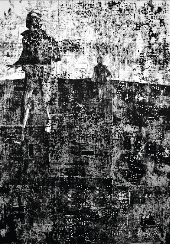 Obraz emanuje tajemniczą, nieco melancholijną aurą. Dominują w nim czernie i biele, tworząc dynamiczną kompozycję pełną kontrastów. Postacie na pierwszym planie wydają się nieco zamazane, niby cień uchwycony w ruchu. To sprawia, że dzieło tchnie duchem niepewności. Wydaje mi się, że artysta używał techniki podobnej do monotypii, gdzie plamy i linie tworzą delikatny chaos. Trochę jak stary telewizor bez sygnału. Atmosfera obrazu jest ciężka, a jednocześnie fascynująca, jak tajemniczy sen. Widz może poczuć się zagubiony, próbując zrozumieć, co autor miał na myśli. "Look, mamo, ktoś się schował!" - to jakby głos dziecka patrzącego na ten obraz. Może wtedy spojrzymy innymi oczami. Myślę, że każdy może odnaleźć tu coś swojego. Obraz wywołuje emocje, jakie zależą od osobistych doświadczeń odbiorcy. Fascynuje mnie sposób, w jaki czarno-biała paleta kolorów może być tak „colorful”. Totalny majstersztyk!