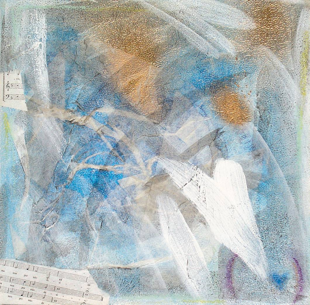 Obraz emanuje spokojem dzięki chłodnym błękitom i szarościom, które przypominają morską bryzę w letni dzień. Gdzieś na horyzoncie, złote akcenty dodają blasku, jakby słońce delikatnie prześwitywało przez chmury. Centralna część kompozycji jest pełna abstrakcyjnych kształtów, nachodzących na siebie warstw, tworząc efekt skóry zmieniającej kolory pod wpływem światła. A w rogu spoczywa kawałek nut, jakby ktoś przypadkiem porzucił fragmencik symfonii na tej artystycznej kartce. Uwielbiam te artystyczne collage'y, które pozwalają widzowi na chwilowe zawieszenie w czasie. Każdy pociągnięcie farby, każdy delikatny szczegół wprowadza widza w stan refleksji. Trochę to magiczne, jak obrazy mogą wywołać tęsknotę za czymś, czego może nigdy nie doświadczyłeś. "Blue jest super," powiedziałoby dziecko, patrząc z podziwem. W stylu artysty widać techniki mieszane - od impasto, przez delikatne muśnięcia pędzlem, aż po subtelne przejścia tonalne. To wszystko tworzy atmosferę tajemniczości i refleksji nad ulotnością chwili. Przypomina filmowy slow-motion, gdzie każda sekunda niesie ze sobą głęboką opowieść.