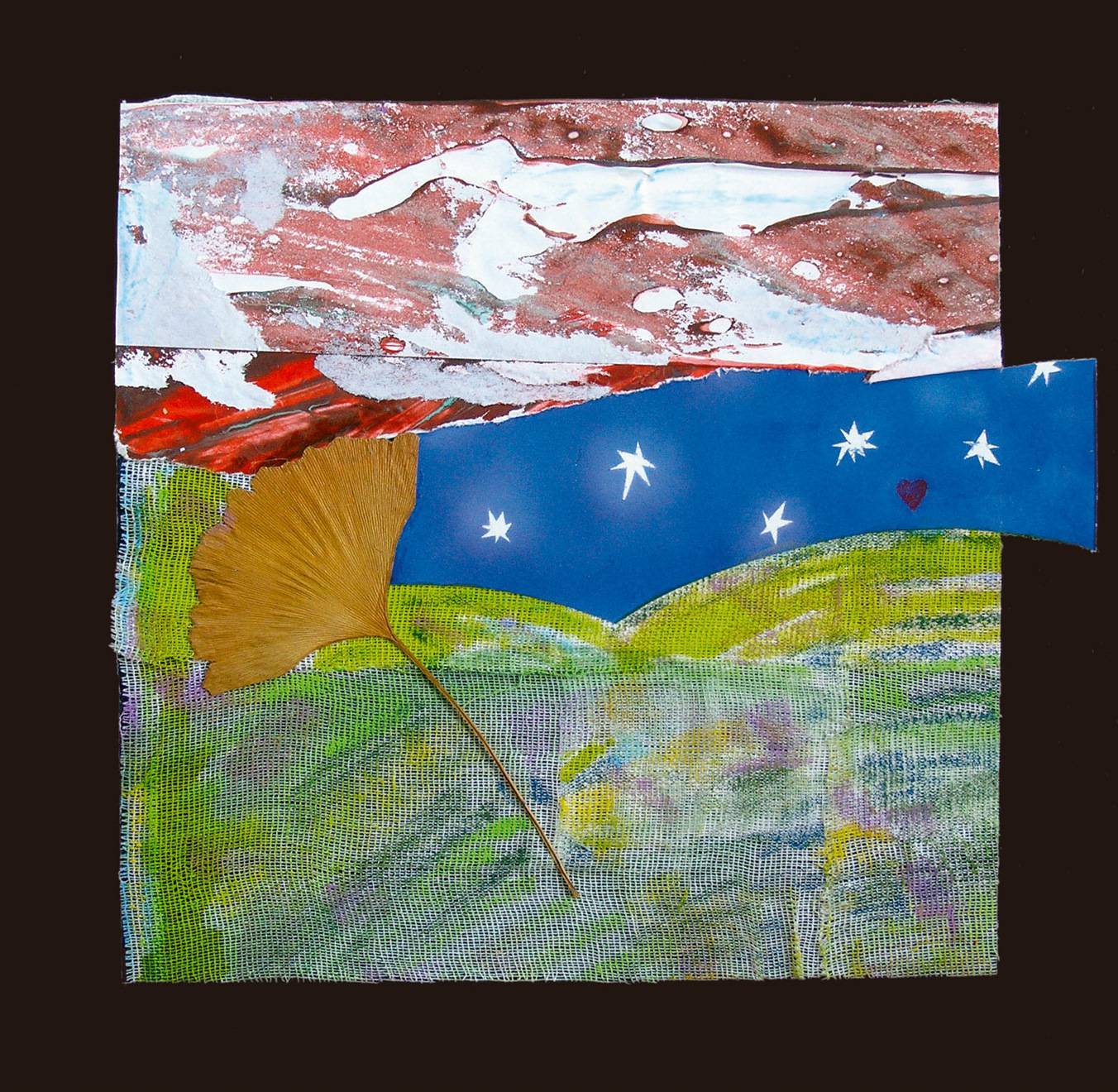 Obraz mieni się kolorami, jakby ktoś rozsypał skrzące się konfetti na płótnie. Dominuje głęboki błękit nocnego nieba, w którym lśnią białe gwiazdy niczym małe świetlne punkciki. Chciałoby się je dotknąć. Na tym tle falują zielone pagórki, na które nałożono siatkę – dodaje to teksturę, która wręcz zaprasza, by jej dotknąć. Na pierwszym planie delikatny listko w kolorze złota. Ot, taki drobiazg, ale jakie robi wrażenie! Patrząc na to dzieło, czuję nostalgiczną nostalgię – jakby przypominało mi zapomniane marzenia z dzieciństwa. Tworzenie tej pracy musiało być rodzajem collage'u. Połączenie różnych technik, od farby przez elementy natury, aż po misterne cięcia papieru. Atmosfera jest magiczna, ciepła, a może nawet trochę surrealistyczna. Artysta bawi się formą i przestrzenią, nie bojąc się być odważnym. Myślę sobie, że emocje, które budzi ten obraz, to mieszanka spokoju i tęsknoty za czymś – może za prostotą dzieciństwa? Ale to serduszko też daje nadzieję. Współczesność spotyka tutaj coś oldschool, co jest szalenie intrygujące. To jak podróż do krainy snów, gdzie wszystko jest możliwe. Oto obraz, który mówi: 'dream big'.