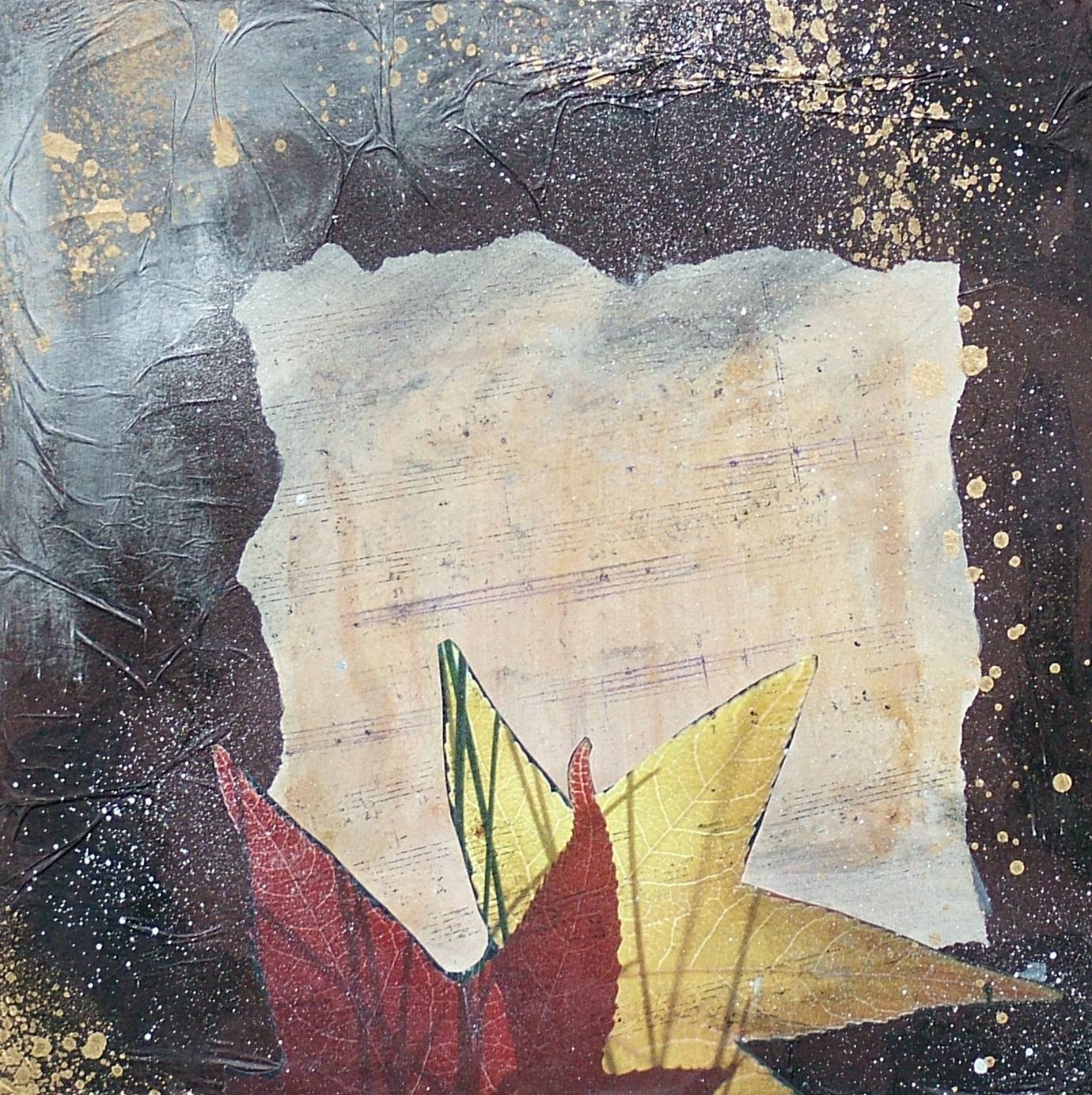 Na obrazie dominują ciepłe, ziemiste barwy: brązy i beże, które przechodzą w nieco chłodniejsze odcienie szarości. Centralną część zajmują kształty przypominające liście, w kolorach czerwieni i żółci, co dodaje całości ciepła i nostalgii jesiennego dnia. Tło to gra niejednolitych faktur i subtelnych plam, które przyciągają wzrok. Jakby dzieło miało w sobie nutkę tajemnicy, tego magicznego elementu, który czasem zaskakuje w formie niespodziewanych detali. Atmosfera obrazu jest spokojna, niemalże refleksyjna. Czujesz, jakby czas zwolnił, a każdy liść opowiadał własną historię. Widzisz staranność artysty w łączeniu tekstur i technik, co tworzy intrygującą warstwę wizualną. To trochę jak „mixed media”, gdzie różne elementy tworzą harmonijną całość. Całość wywołuje emocje związane z przemijaniem, z tym jak piękno tkwi w prostocie. Może to nostalgia za minionym latem? 7-letnie dziecko mogłoby powiedzieć: „Liście wyglądają, jakby chciały tańczyć na wietrze!”. Patrząc na to, czujesz coś w rodzaju ciepłego „wow”. Może to właśnie ten urok jesieni, który sprawia, że serce bije szybciej, a ty uśmiechasz się z czułością do wspomnień.