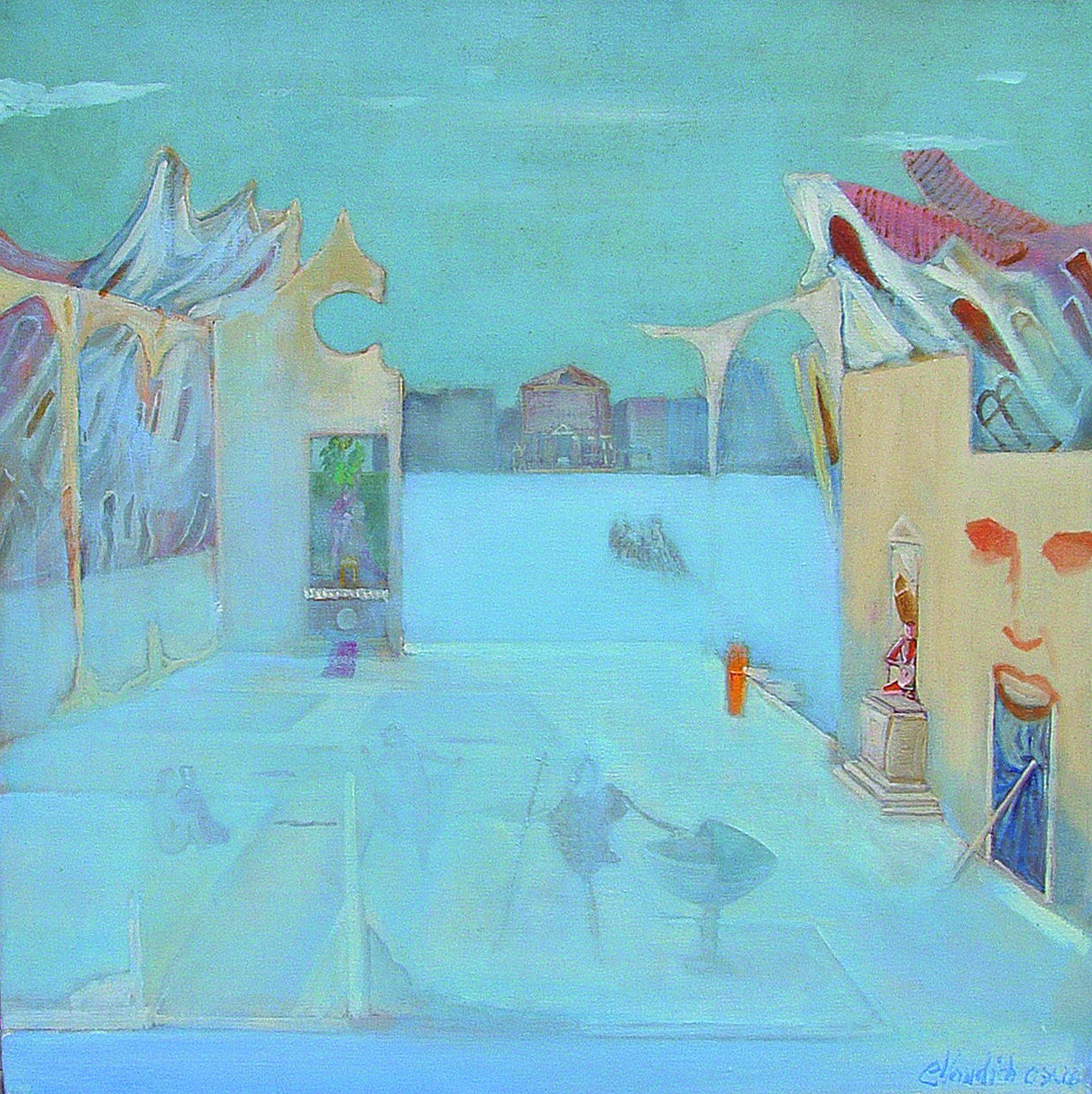 Obraz emanuje tajemniczością i spokojem. Dominują pastelowe, chłodne kolory: błękity, zielenie i delikatne odcienie fioletu. Kompozycja jest nieco surrealistyczna, jakby wyjęta z sennych marzeń. W centrum sceny można dostrzec mglistą postać, prawie zanurzoną w jasnym tle. Po lewej stronie wyłaniają się fantazyjne struktury, które przypominają magiczne zamki, a może namioty z innego świata. "Czy to domek dla lalek, mamusiu?" – zapytało pewnie jakieś dziecko, patrząc na to dzieło. Atmosfera jest i nostalgicza i spokojna. Mamy tu poczucie zawieszenia w czasie, jakby obraz chciał nas zatrzymać w swojej krainie bez początku i końca. Artysta zastosował technikę łagodnych pociągnięć pędzla, co dodaje pracy subtelności. Styl przypomina trochę impresjonizm, ale z nutką dreamscape. Ten obraz budzi różne emocje: ciekawość, zamyślenie, delikatne uniesienie. Każdy widz może dostrzec w nim coś własnego, coś personal. Patrząc na to dzieło, czuję, jakby świat chwilowo zwolnił tempo, a my znaleźliśmy się w sferze między jawą a snem. I tak, to wszystko w rytmie "dreamy" bluesa zaczyna nabierać sensu.