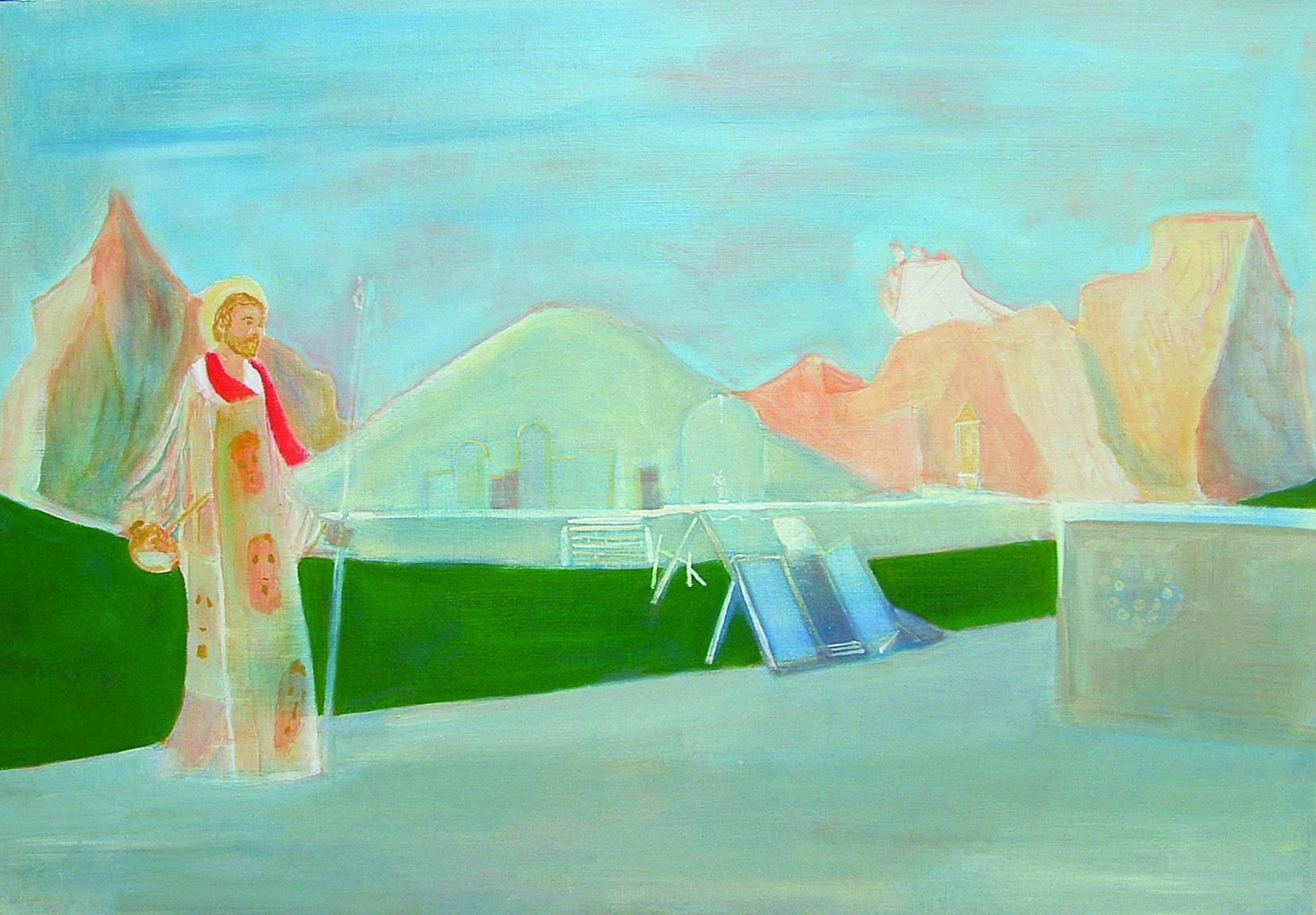 Na obrazie dominuje delikatna paleta pastelowych barw. Góry w tle są w ciepłych odcieniach pomarańczu i różu, a niebo przybiera mlecznoniebieski kolor. Postać starca w szatach z czerwonymi detalami przyciąga wzrok. Jego sylwetka kontrastuje z zielenią trawy, tworząc ciekawą kompozycję, która jest jednocześnie harmonijna, jak i intrygująca. Hmm, jakby się nad tym zastanowić, obraz emanuje spokojem i refleksją. Jest cichy, ale mówi wiele. Styl artystyczny bliski jest malarstwu impresjonistycznemu, z miękkimi przejściami kolorów i subtelną grą światła. Technika używana przez artystę wydaje się składać z delikatnych pociągnięć pędzla, tworzących eteryczny nastrój. Można poczuć delikatną aurę nostalgii i kontemplacji, która zaprasza widza do zatrzymania się na chwilę. Hey, to jest jak sen, w którym czas przestaje istnieć. Obraz skłania do refleksji nad przemijaniem i poszukiwaniem duchowej głębii. Jak się patrzy na ten obraz, to czuje się ciepło i spokój, jakby się siedziało z kubkiem kakao przy kominku. To takie "chill" doświadczenie, które sprawia, że człowiek chce się zatrzymać i po prostu być tu i teraz.