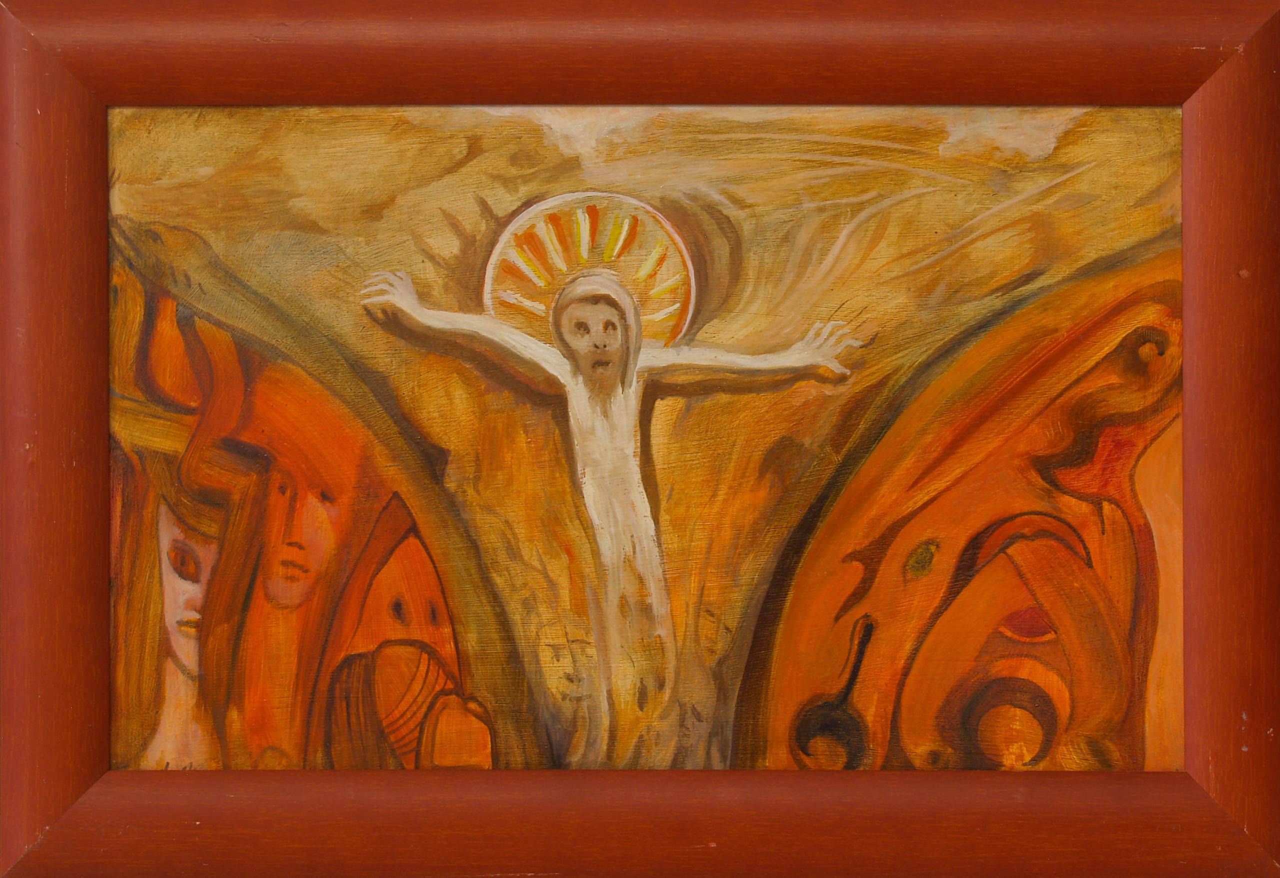Obraz emanuje intensywnością barw, dominującymi ciepłymi odcieniami pomarańczu, brązu i złota. Centralną postacią jest figura z rozpostartymi ramionami, której twarz wyraża mieszankę spokoju i cierpienia. Kompozycja zdaje się pulsować, a linie są dynamiczne i rozedrgane jakby chwiała się na krawędzi chaosu. Atmosfera jest gęsta, prawie mistyczna, przywodząca na myśl enigmatyczne opowieści o transcendencji i odkupieniu. Artystycznie obraz przypomina surrealistyczne dzieła z nutką ekspresjonizmu. Technika użyta przez artystę jest swobodna, z widocznymi pociągnięciami pędzla, tworzącymi teksturę pełną ruchu i energii. To artystyczne "wow" może budzić refleksje o duchowej podróży czy ulotności egzystencji. Mogłoby napisać o tym każde dziecko: "A pan na obrazku ma aureolę jak halo!". Obraz porywa widza, wciągając go w swoje nieoczywiste zakamarki. Czuję lekki dreszcz emocji patrząc na tę wizualną zagadkę. Jest jak "magic" zatrzymany w czasie, zmuszający odbiorcę do poszukiwania głębszych znaczeń. Pełen emocjonalnego napięcia i osobistych projektów artysty, obraz nie pozostawia obojętnym.