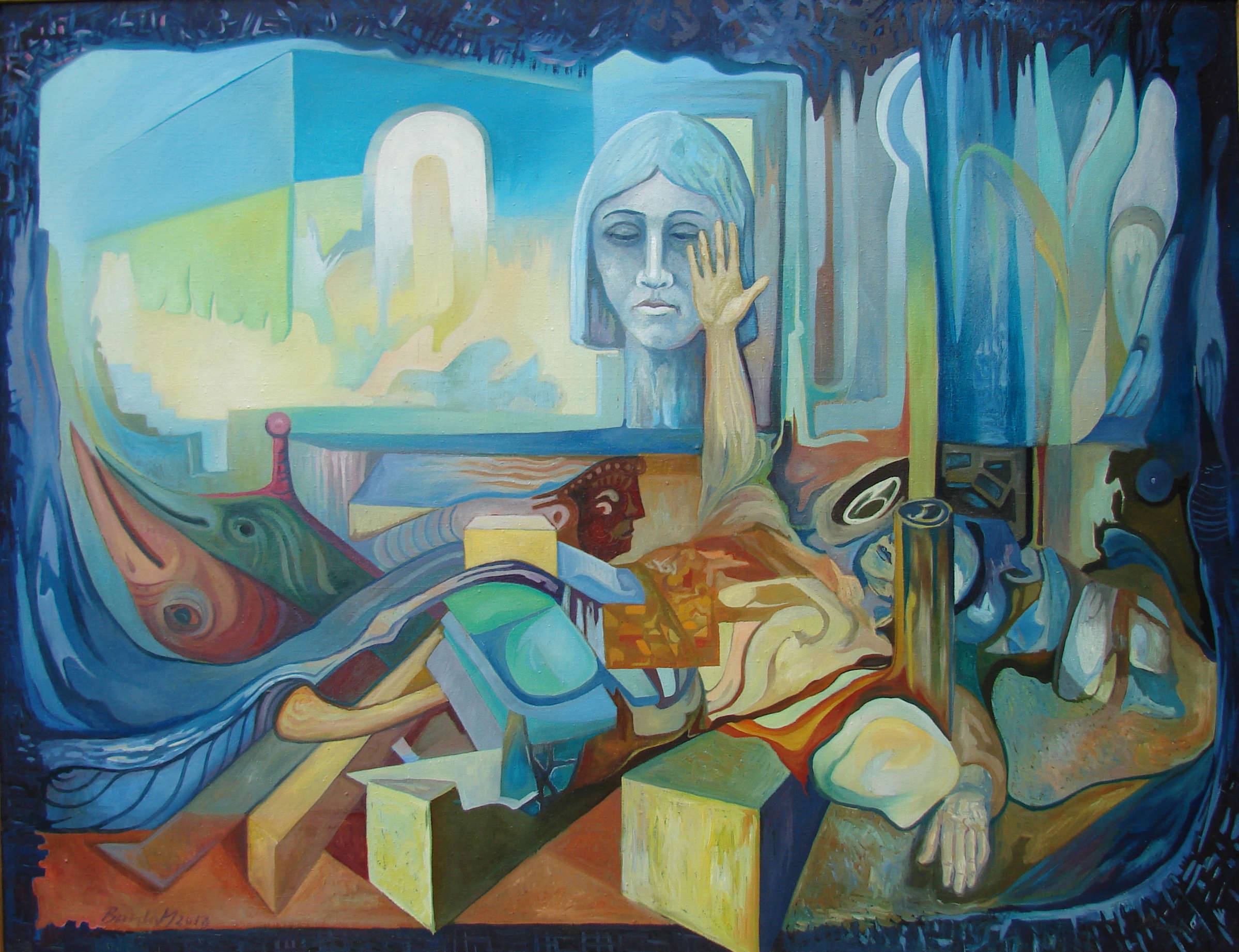 Obraz tętni życiem i kolorami. Przeważają błękity i zielenie, które płynnie przechodzą w ciepłe odcienie żółci i pomarańczy. Kształty są zawiłe i nieco surrealistyczne. Centralnym punktem jest twarz, otoczona dziwacznymi formami i przedmiotami, jakby wyrwanymi z sennych marzeń. Całość sprawia wrażenie płynności, nic nie jest proste i oczywiste. Atmosfera obrazu? Pełna tajemnicy, wręcz magiczna. Styl artystyczny to jakby surrealizm z nutką impresjonizmu. Artysta stosuje dynamiczne pociągnięcia pędzla. Kolory są odważne, kontrasty wyraźne, tworząc iluzję głębi. Może to być sen o innej rzeczywistości. Wygląd obrazu wywołuje mieszane uczucia. Z jednej strony, fascynacja; z drugiej – trochę niepokój. Dla mnie to jak podróż w nieznane. A dziecko powiedziałoby, że to obraz świata, w którym wszystko się może zdarzyć. Trudno oderwać wzrok! It's mesmerizing. Obraz jest jak kalejdoskop emocji. Ukazuje siłę wyobraźni i magię chaosu. Patrząc na niego, czujesz, że jesteś częścią tej historii. Ta surrealistyczna wizja przemawia do nas, zaskakuje i pobudza do myślenia. Czy to sen, czy rzeczywistość?