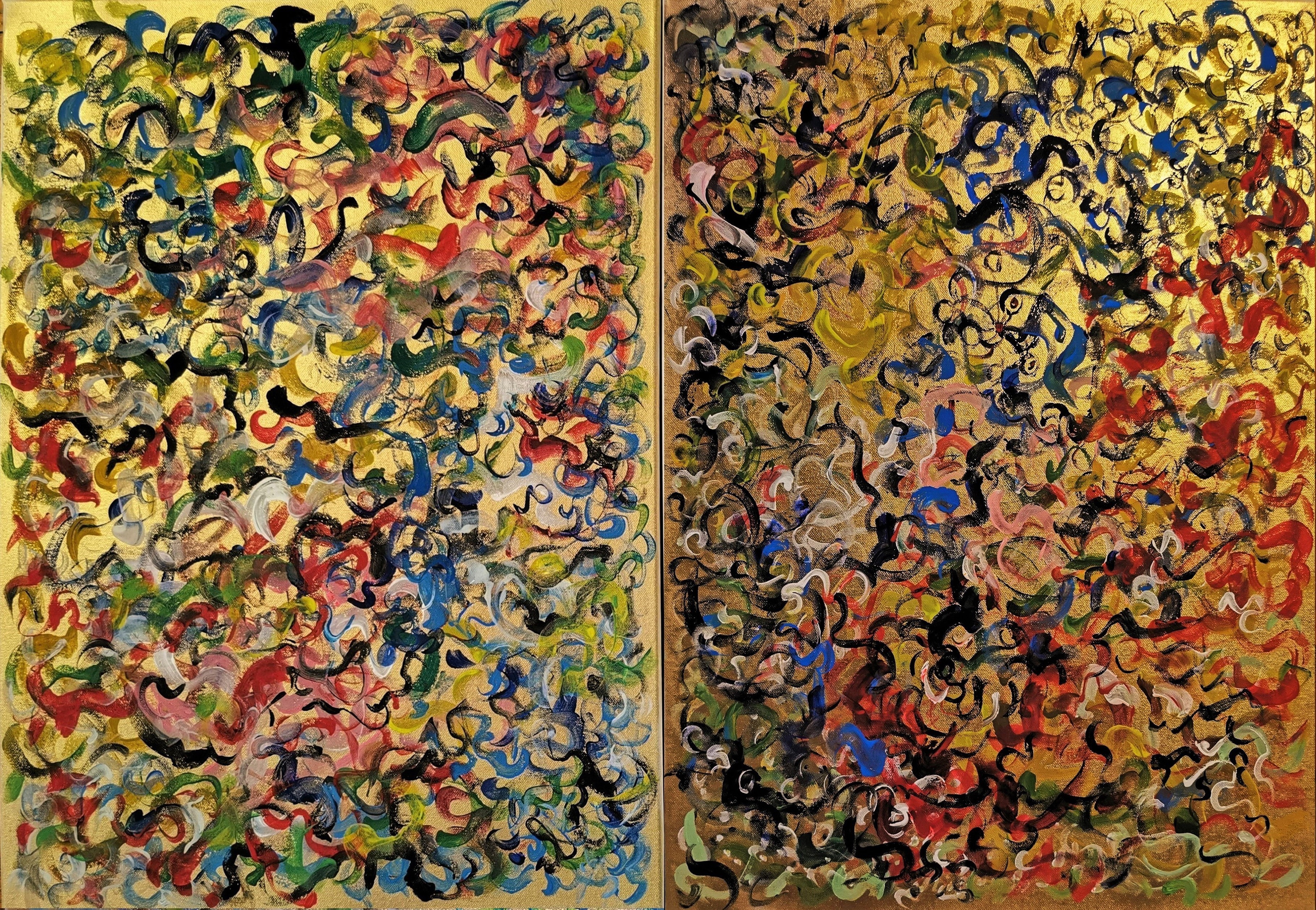 Na tym obrazie aż roi się od energetycznych wirów plam i linii. Bogata paleta pełna jest czerwieni, zieleni i niebieskości, które intensywnie kontrastują z tłem złocistego zabarwienia. Kompozycja tego dzieła, choć chaotyczna, wydaje się być skrupulatnie przemyślana. Faktura pełna jest ruchu i ekspresji, jakby artysta włożył w to serce i duszę. To dzieło wygląda trochę jak taniec kolorowych wstęg, ale bardziej przypomina mi zabawę w "co widzisz". Jest fun! Atmosfera jest pełna energii, wręcz kipiąca. Wydaje się, że każdy z tych kolorowych zygzaków pragnie wyrazić swoją indywidualność. Styl przypomina abstrakcyjny ekspresjonizm. Technika wydaje się swobodna, jakby pędzle były przedłużeniem umysłu twórcy. To kompletny freestyle. Trudno nie poczuć radości patrząc na to cudo, chociaż czasem można dostrzec w tej fali coś więcej – jakby obraz mówił, że w chaosie kryje się porządek. Patrząc na obraz, można poczuć zachwyt, podziw, a nawet zdziwienie. Wow, to jest mega. To wszystko razem tworzy kalejdoskop wrażeń, które pozostają w głowie na długo. Fascynujące, jak każdy element obrazu, choć na pierwszy rzut oka abstrakcyjny, dodaje się do całej układanki. It's like a symphony of colors. Można się zastanawiać, co autor chciał przekazać, ale to w sumie nie ma znaczenia. Obraz po prostu żyje.